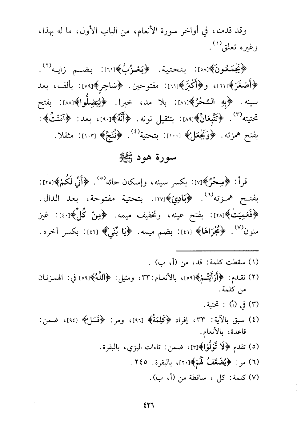 قَرَأَ: {سحر} : بِكَسْر سينه، وَإِسْكَان حائه. {إِنِّي لكم} : بِفَتْح همزته. {بَادِي} : بتحتية مَفْتُوحَة، بعد الدَّال. {فعميت} : بِفَتْح عينه، وَتَخْفِيف ميمه. {من كل} : غير منون. {مجْراهَا} : بِضَم ميمه. {يَا بني} : بِكَسْر آخِره.
