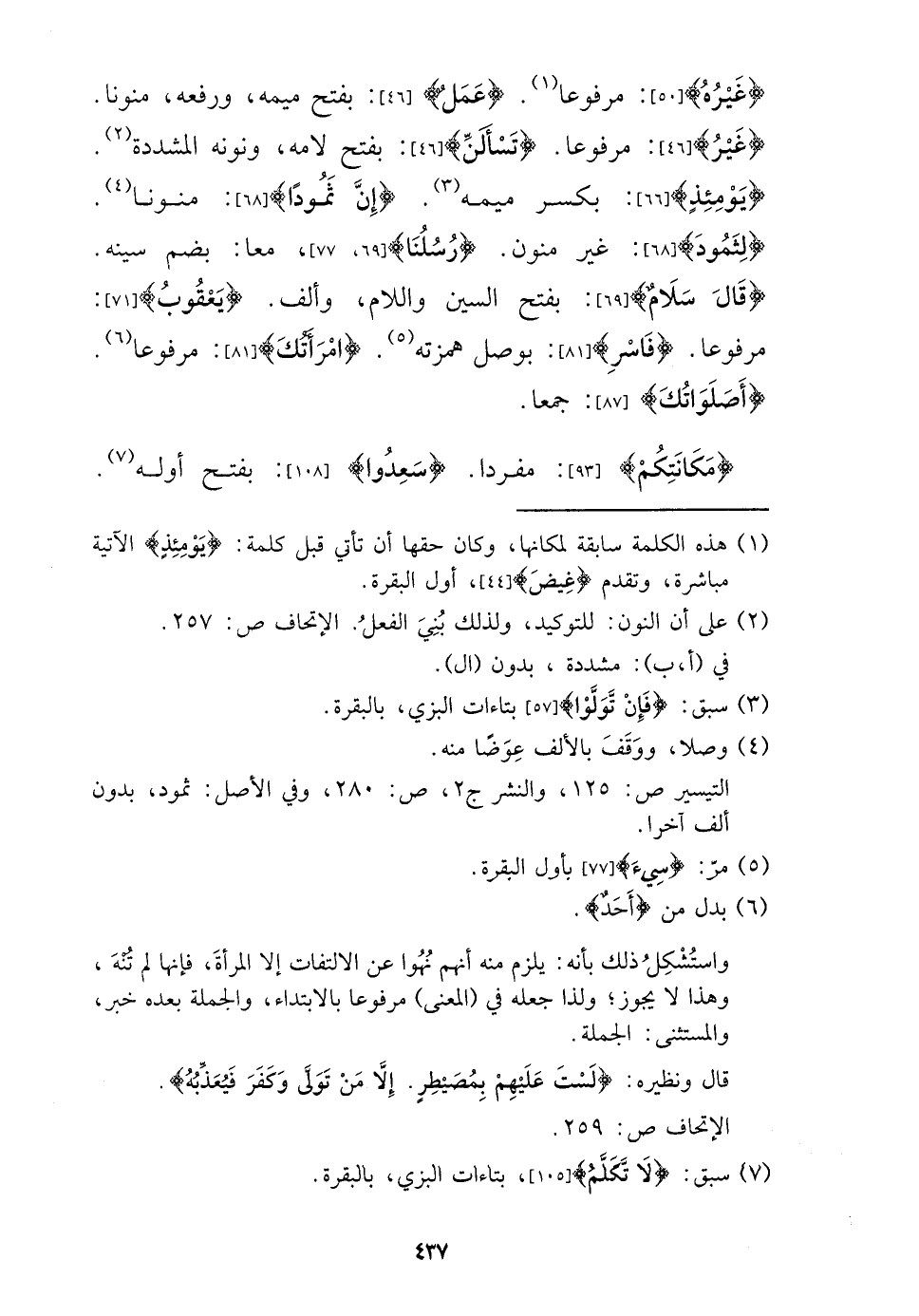 {غَيره} : مَرْفُوعا. {عمل} : بِفَتْح ميمه، وَرَفعه، منونا. {غير} : مَرْفُوعا. {تسألن} : بِفَتْح لامه، ونونه الْمُشَدّدَة. {يَوْمئِذٍ} : بِكَسْر ميمه. {إِن ثموداً} : منونا. {لثمود} : غير منون. {رسلنَا} ، مَعًا: بِضَم سينه. {قَالَ سَلام} : بِفَتْح السِّين وَاللَّام، وَألف. {يَعْقُوب} : مَرْفُوعا. {فاسر} : بوصل همزته. {امْرَأَتك} : مَرْفُوعا. {أصلواتك} : جمعا.