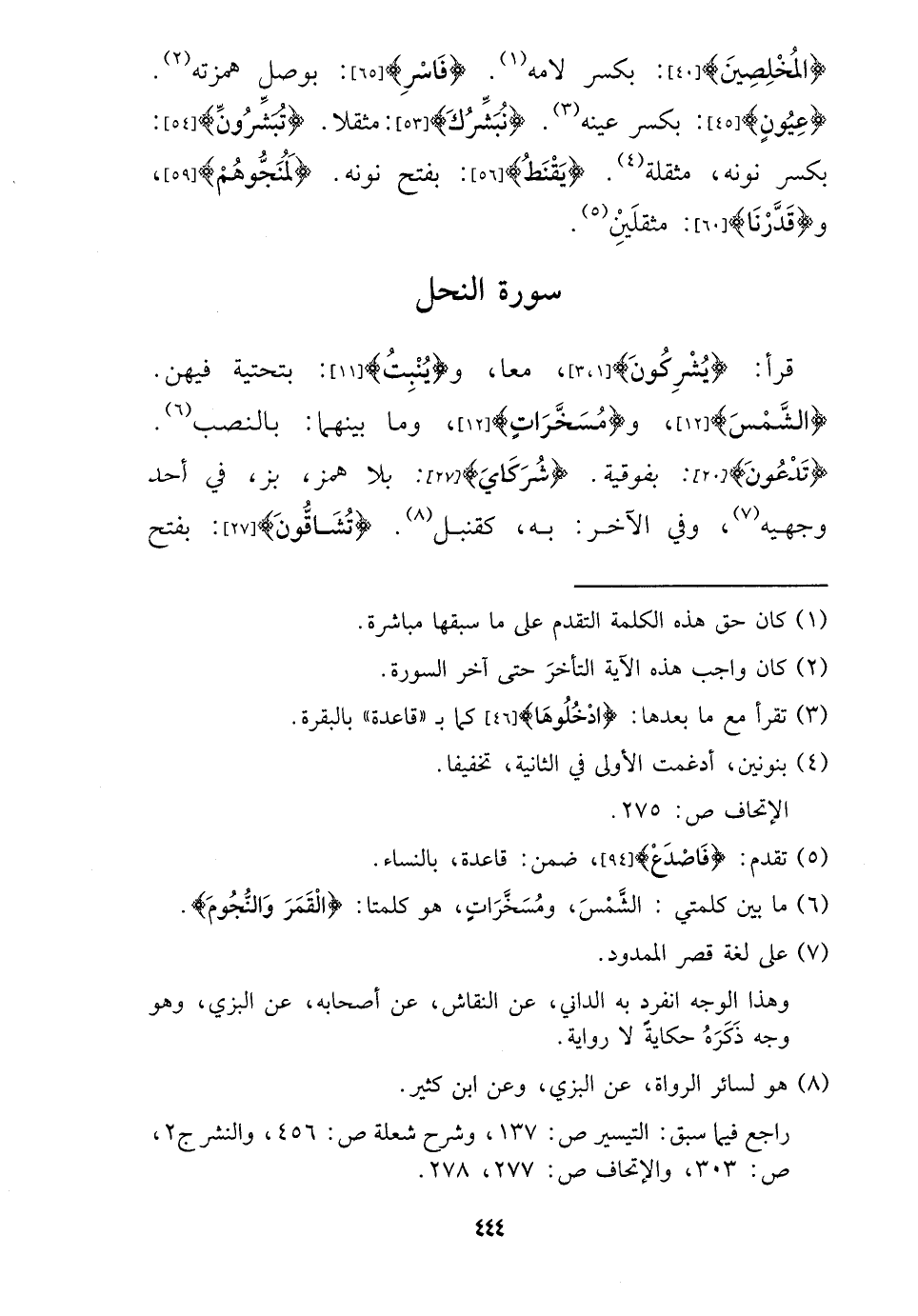 قَرَأَ: {يشركُونَ} ، مَعًا، و {ينْبت} : بتحتية فِيهِنَّ. {الشَّمْس} ، و {مسخرات} ، وَمَا بَينهمَا: بِالنّصب. {تدعون} : بفوقية. {شركاي} : بِلَا همز، بز، فِي أحد وجهيه، وَفِي الآخر: بِهِ، كقنبل. {تشاقون} : بِفَتْح