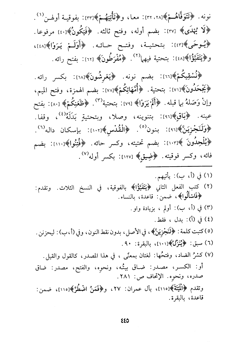 نونه. {تتوفاهم} : مَعًا، و {تأتيهم} : بفوقية أولهنَّ. {لَا يهدى} : بِضَم أَوله، وَفتح ثالثه. {فَيكون} مَرْفُوعا. {يُوحى} : بتحتية، وَفتح حائه. {أولم يرَوا} ، و {يتفيؤا} : بتحتية فيهمَا. {مفرطون} : بِفَتْح رائه.