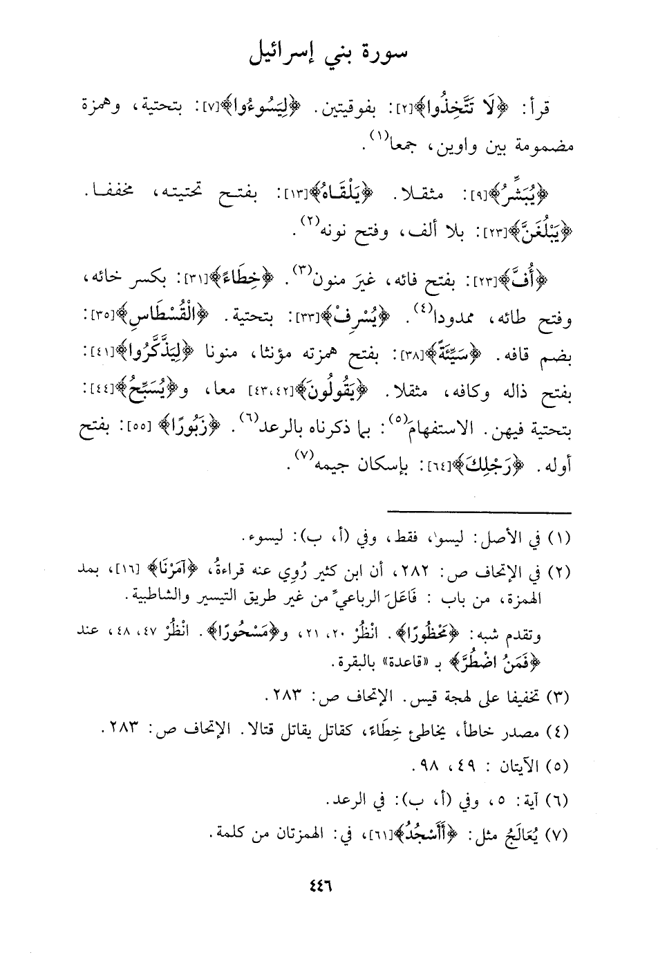 {أُفٍّ} : بِفَتْح فائه، غير منون. {خطاء} : بِكَسْر خائه، وَفتح طائه، ممدودا. {يسرف} : بتحتية. {القسطاس} : بِضَم قافه. {سَيِّئَة} : بِفَتْح همزته مؤنثا، منونا {لِيذكرُوا} : بِفَتْح ذاله وكافه، مُثقلًا. {يَقُولُونَ} مَعًا، و {يسبح} : بتحتية فِيهِنَّ. الِاسْتِفْهَام: بِمَا ذَكرْنَاهُ بالرعد. {زبورا} : بِفَتْح أَوله. {رجلك} : بِإِسْكَان جيمه.
