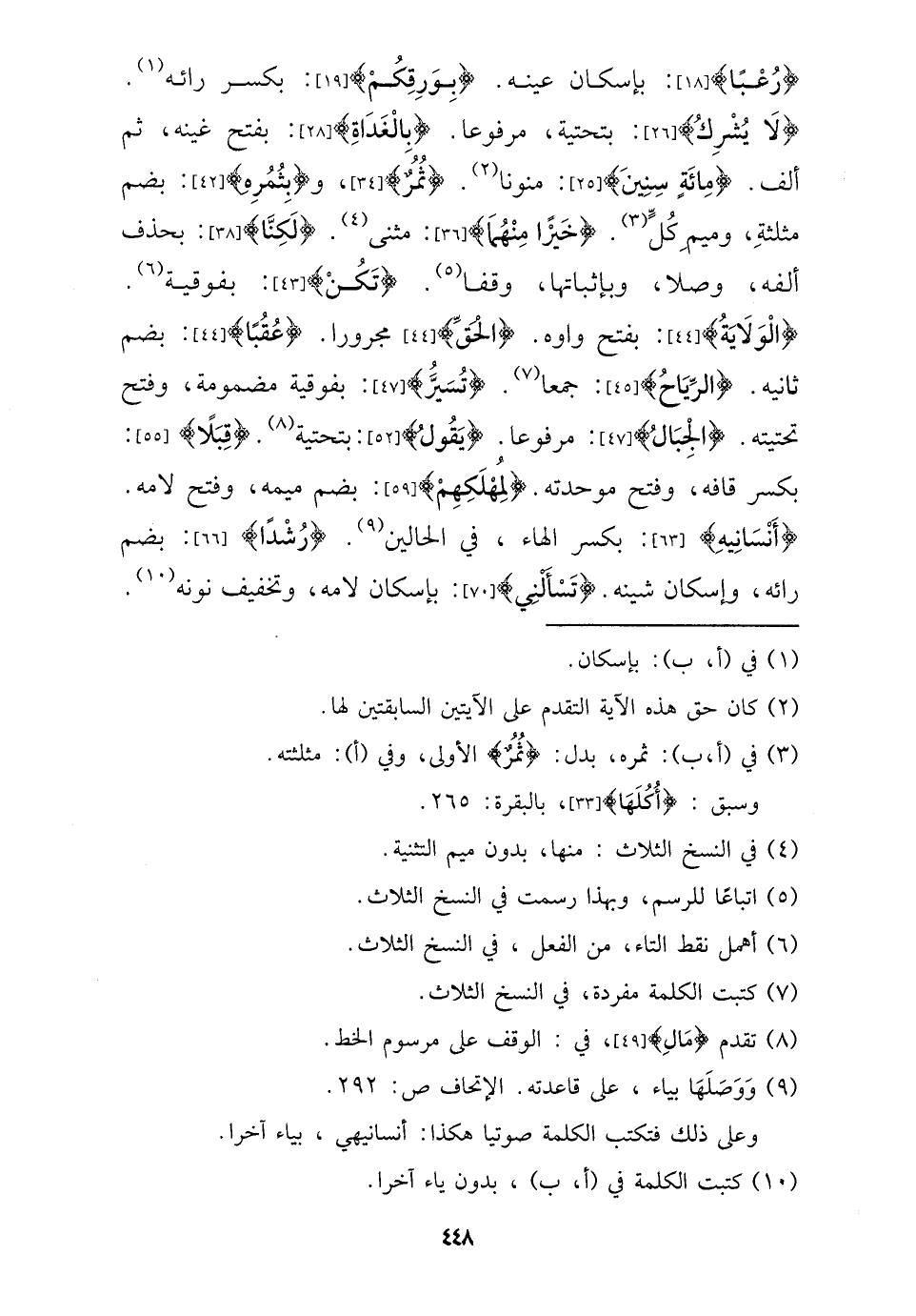 {رعْبًا} : بِإِسْكَان عينه. {بورقكم} : بِكَسْر رائه. {لَا يُشْرك} : بتحتية، مَرْفُوعا. {بِالْغَدَاةِ} : بِفَتْح غينه، ثمَّ ألف. {مائَة سِنِين} : منونا. {ثَمَر} ، و {بثمره} : بِضَم مُثَلّثَة، وَمِيم كل. {خيرا مِنْهُمَا} : مثنى. {لَكنا} : بِحَذْف أَلفه، وصلا، وبإثباتها، وَقفا. {تكن} : بفوقية. {الْولَايَة} : بِفَتْح واوه. {الْحق} مجرورا. {عقبا} : بِضَم ثَانِيه. {الرِّيَاح} : جمعا. {تسير} : بفوقية مَضْمُومَة، وَفتح تحتيته. {الْجبَال} : مَرْفُوعا. {يَقُول} : بتحتية. {قبلا} : بِكَسْر قافه، وَفتح موحدته. {لمهلكهم} : بِضَم ميمه، وَفتح لامه. {أنسانيه} : بِكَسْر الْهَاء، فِي الْحَالين. {رشدا} : بِضَم رائه، وَإِسْكَان شينه. {تَسْأَلنِي} : بِإِسْكَان لامه، وَتَخْفِيف نونه.