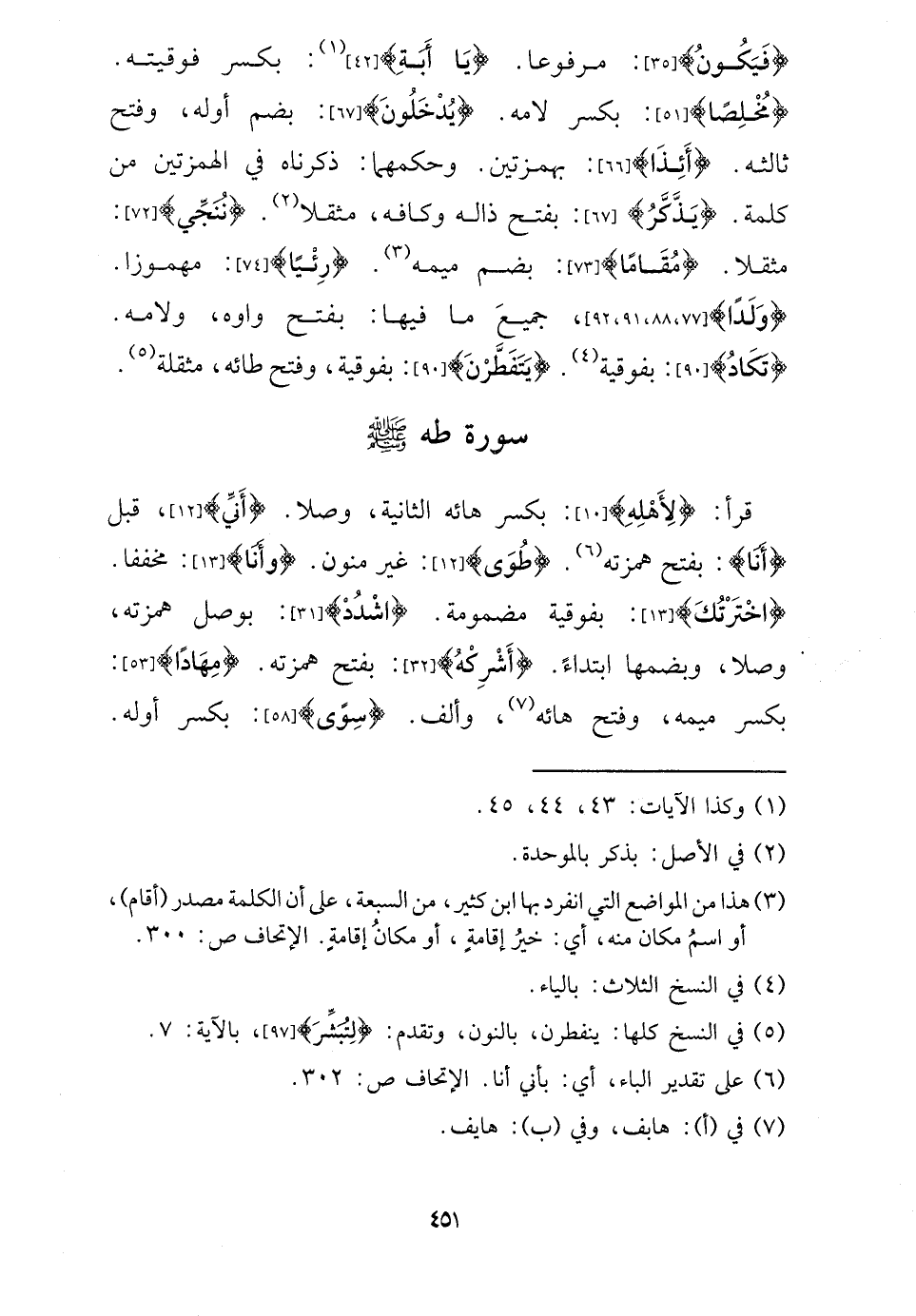 قَرَأَ: {لأَهله} : بِكَسْر هائه الثَّانِيَة، وصلا. {أَنِّي} ، قبل {أَنا} : بِفَتْح همزته. {طوى} : غير منون. {وَأَنا} : مخففا. {اخْتَرْتُك} : بفوقية مَضْمُومَة. {اشْدُد} : بوصل همزته، وصلا، وَبِضَمِّهَا ابْتِدَاء. {اشركه} : بِفَتْح همزته. {مهاداً} : بِكَسْر ميمه، وَفتح هائه، وَألف. {سوى} : بِكَسْر أَوله.
