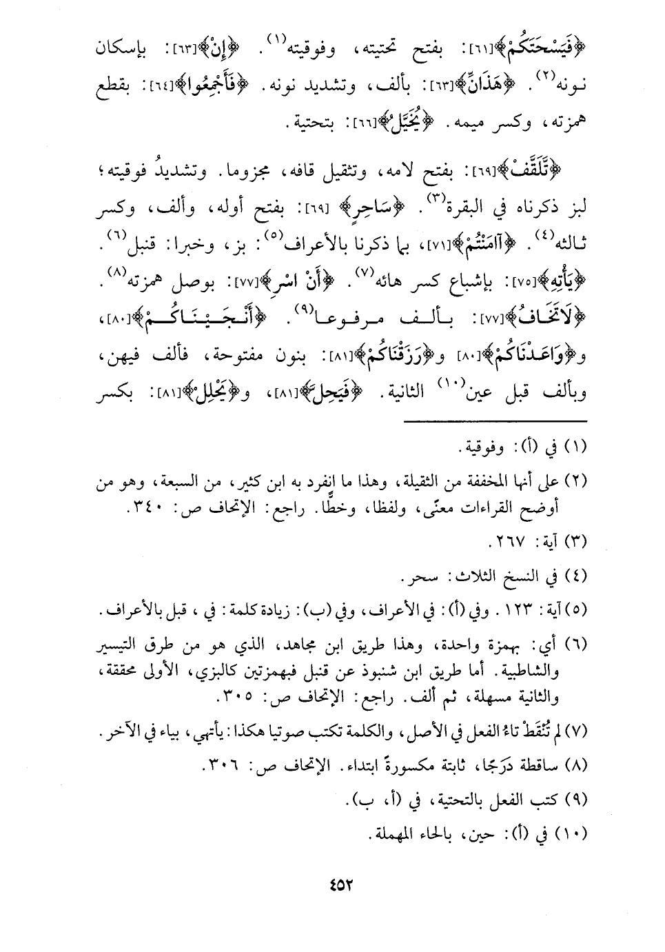 {فيسحتكم} : بِفَتْح تحتيته، وفوقيته. {إِن} : بِإِسْكَان نونه. {هَذَانِ} : بِأَلف، وَتَشْديد نونه. {فَأَجْمعُوا} : بِقطع همزته، وَكسر ميمه. {يخيل} : بتحتية.