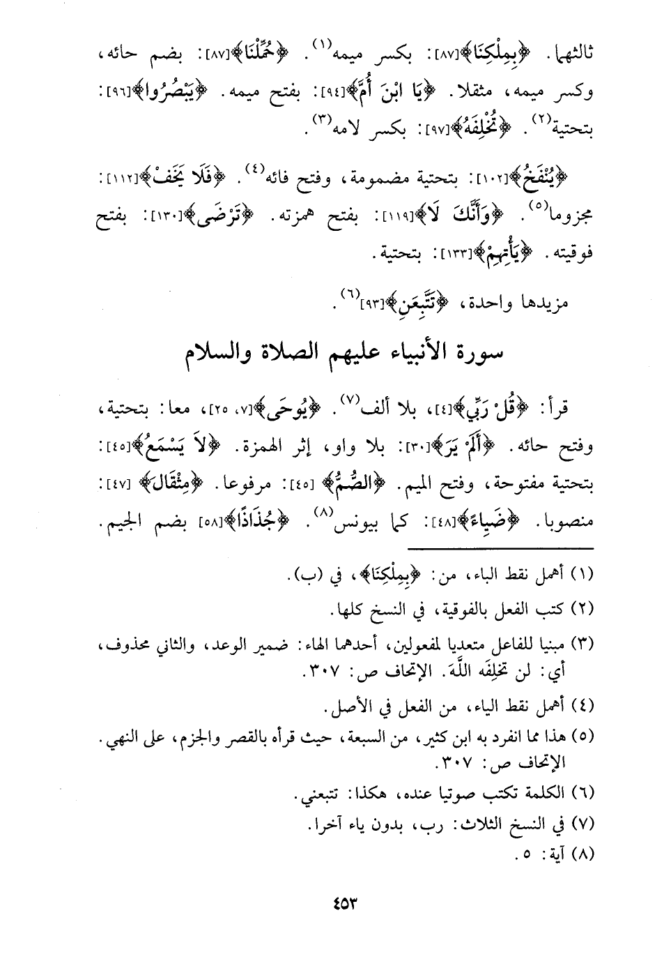 ثالثهما. {بملكنا} : بِكَسْر ميمه. {حملنَا} : بِضَم حائه، وَكسر ميمه، مُثقلًا. {يَا ابْن ابْن أم} : بِفَتْح ميمه. {يبصروا} : بتحتية. {تخلفه} : بِكَسْر لامه.