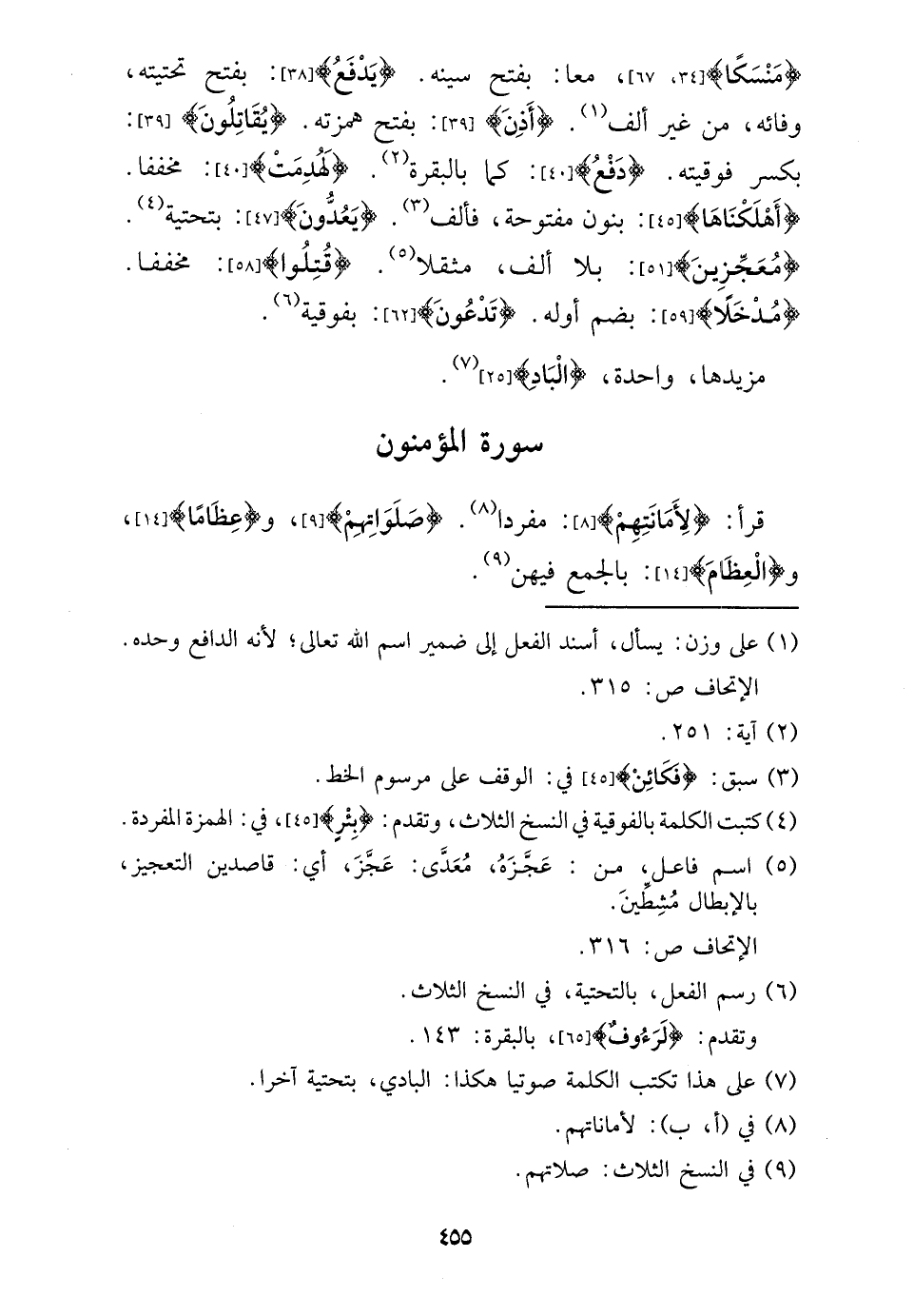 {منسكا} ، مَعًا: بِفَتْح سينه. {يدْفع} : بِفَتْح تحتيته، وفائه، من غير ألف. {أذن} : بِفَتْح همزته. {يُقَاتلُون} : بِكَسْر فوقيته. {دفع} : كَمَا بالبقرة. {لهدمت} : مخففا. {أهلكناها} : بنُون مَفْتُوحَة، فألف. {يعدون} : بتحتية. {معجزين} : بِلَا ألف، مُثقلًا. {قتلوا} : مخففا. {مدخلًا} : بِضَم أَوله. {تدعون} : بفوقية.