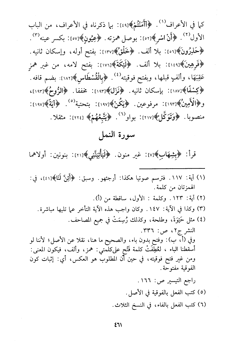 كَمَا فِي الْأَعْرَاف. {آأمنتم} : بِمَا ذَكرْنَاهُ فِي الْأَعْرَاف، من الْبَاب الأول. {أَن اسر} : بوصل همزته. {عُيُون} : بِكَسْر عينه. {حذرون} : بِلَا ألف. {خلق} : بِفَتْح أَوله، وَإِسْكَان ثَانِيه. {فرهين} : بِلَا ألف. {ليكة} : بِفَتْح لامه، من غير همز عَقبهَا، وَألف قبلهَا، وبفتح فوقيته. {بالقسطاس} : بِضَم قافه. {كسفا} : بِإِسْكَان ثَانِيه. {نزل} : مخففا. {الرّوح} ، و {الْأمين} : مرفوعين. {يكن} : بتحتية. {آيَة} : مَنْصُوبًا. {وتوكل} : بواو. {يتبعهُم} : مُثقلًا.