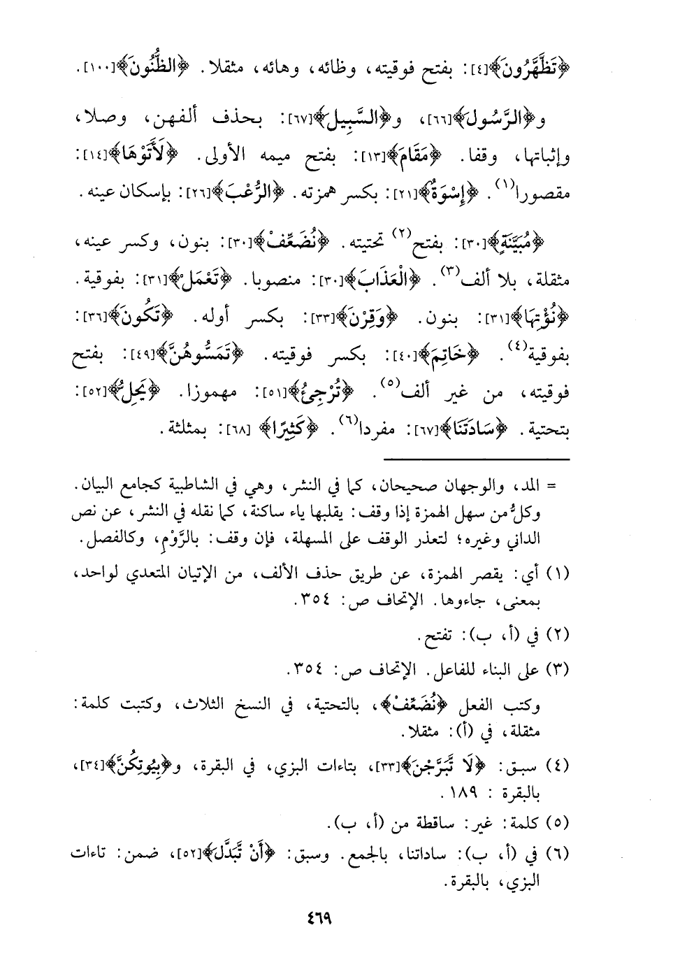 {مبينَة} : بِفَتْح تحتيته. {نضعف} : بنُون، وَكسر عينه، مثقلة، بِلَا ألف. {الْعَذَاب} : مَنْصُوبًا. {تعْمل} : بفوقية {نؤتها} بنونن {وَقرن} : بِكَسْر أَوله. {تكون} : بفوقية. {خَاتم} : بِكَسْر فوقيته. {تمَسُّوهُنَّ} : بِفَتْح فوقيته، من غير ألف. {ترجئ} : مهموزا. {يحل} : بتحتية. {سادتنا} : مُفردا. {كثيرا} : بمثلثة.