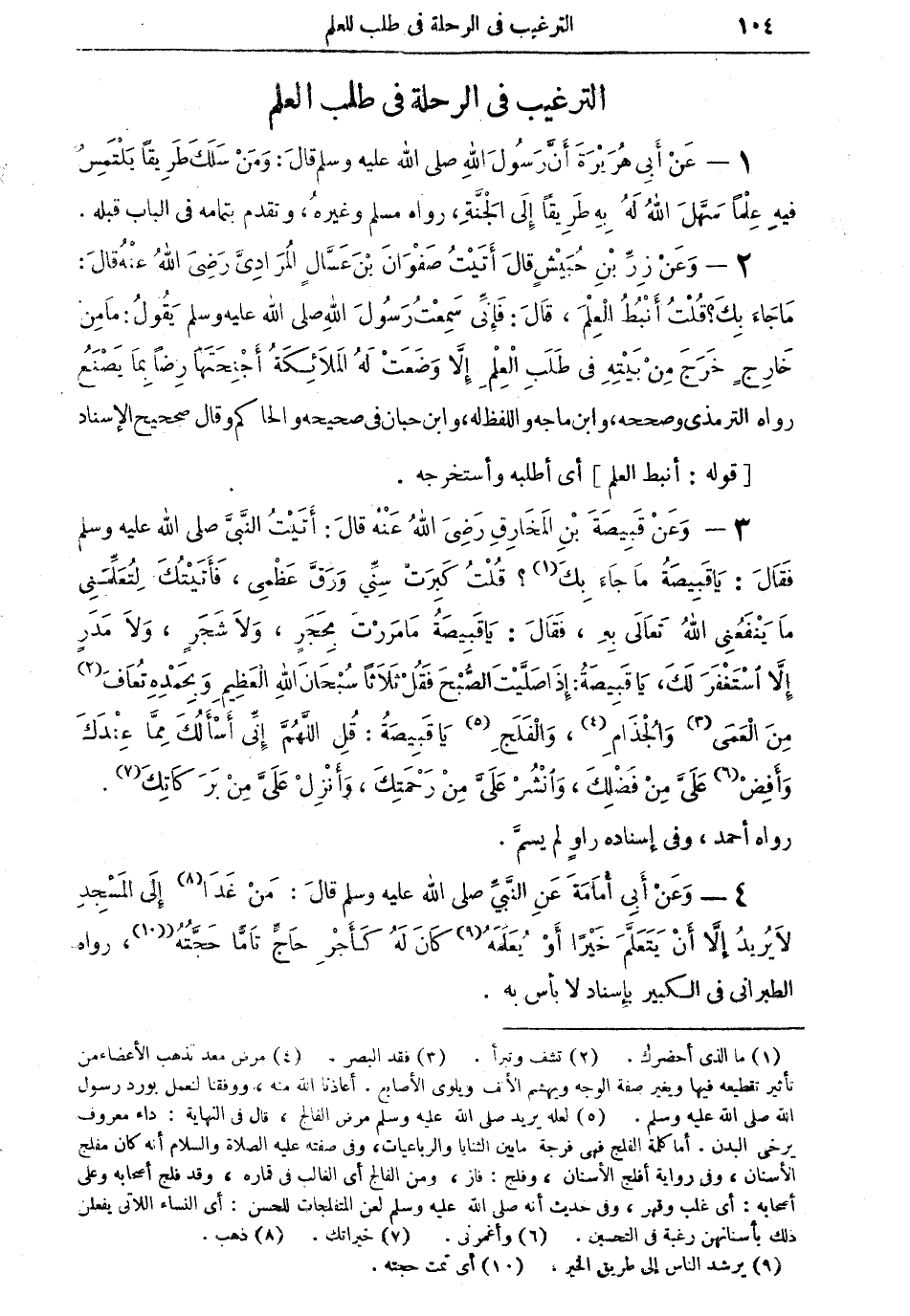 1 - عن أبي هريرة أن رسول الله صلى الله عليه وسلم قال: ومن سلك طريقا يلتمس فيه علما سهل الله به طريقا إلى الجنة. رواه مسلم وغيره، وتقدم بتمامه في الباب قبله.