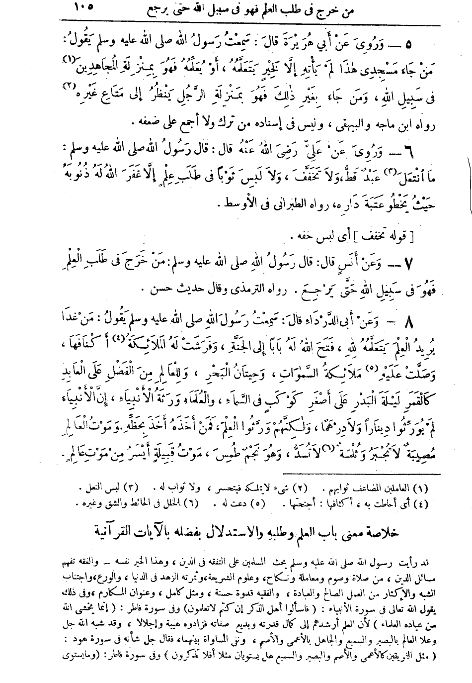 7 - وعن أنس قال: قال رسول الله صلى الله عليه وسلم: من خرج في طلب العلم فهو في سبيل الله حتى يرجع. رواه الترمذي وقال حديث حسن.