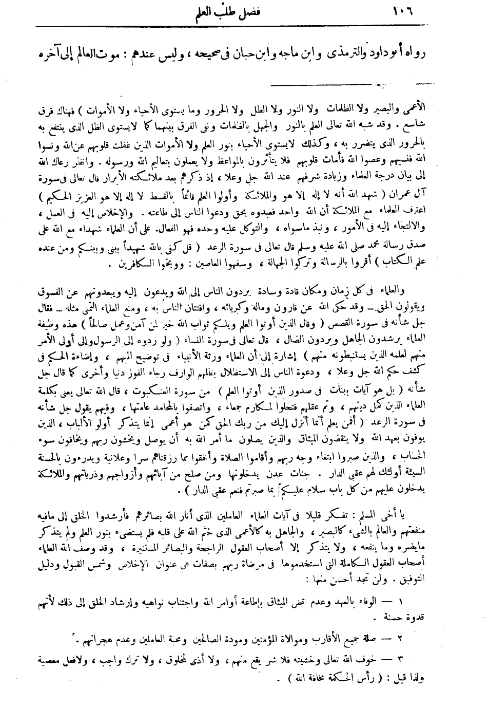 = الأعمى والبصير ولا الظلمات ولا النور ولا الظل ولا الحرور وما يستوى الأحياء ولا الأموات) فهناك فرق شاسع، وقد شبه الله تعالى العلم بالنور والجهل بالظلمات ونفى الفرق بينهما كل لا يستوي الظل الذي ينتفع به بالحرور الذي يتضرر به، وكذلك لا يستوى الأحياء بنور العلم ولا الأموات الذين غفلت قلوبهم عن الله ونسوا الله فنسيهم وعصوا الله فأمات قلوبهم فلا يتأثرون بالمواعظ ولا يعملون بتعاليم الله ورسوله. وانظر رعاك الله إلى بيان درجة العلماء وزيادة شرفهم عند الله جل وعلا، إذ ذكرهم بعد ملائكته الأبرار قال تعالى في سورة آل عمران (شهد الله إنه لا إله إلا هو والملائكة وأولوا العلم قائماً بالقسط لا إله إلا هو العزيز الحكيم) اعترف العلماء مع الملائكة أن الله واحد فعبدوه بحق ودعوا الناس إلى طاعته. والإخلاص إليه في العمل، والالتجاء إليه في الأمور، ونبذ ما سواه، والتوكل عليه وحده فهو الفعال. على أن العلماء شهداء مع الله على صدق رسالة محمد صلى الله عليه وسلم قال تعالى في سورة الرعد (قل كفى بالله شهيداً بينى وبينكم ومن عنده علم الكتاب) أقروا بالرسالة وتركوا الجهالة، وسفهوا العاصين: ووبخوا الكافرين.