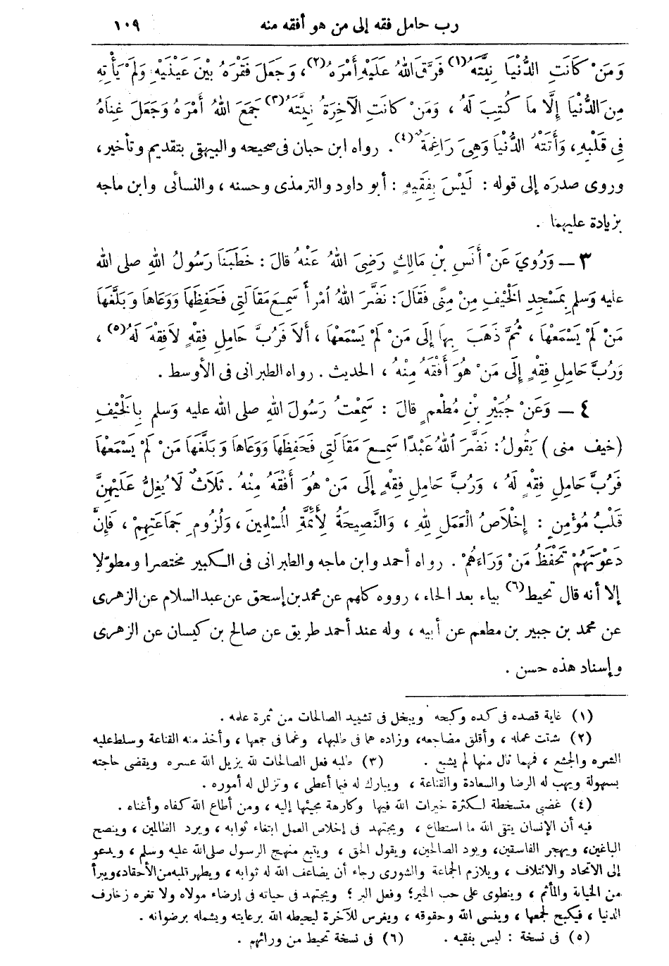 3 - وروى عن أنس بن مالك رضي الله عنه قال: خطبنا رسول الله صلى الله عليه وسلم بمسجد الخيف من منى فقال: نضر الله امرأً سمع مقالتي فحفظها ووعاها وبلغها من لم يسمعها، ثم ذهب بها إلى من لم يسمعها ألا فَرُبَّ حامل فقهٍ لا فقه له (¬5)، ورب حامل فقه إلى من هو أفقه منه، الحديث. رواه الطبراني في الأوسط.