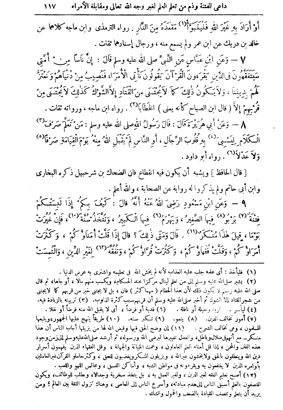 (¬2) يشير صلى الله عليه وسلم إلى من تعلم لينال مركزا عند الحكام، ويكسب منهم مالا، أو جاها، ثم قال صلى الله عليه وسلم لا يكون ذلك لأن هذا الحطام (مهما كثر) فإن، بل لا يجتنى خير من قربهم كما لا يجتنى من شجر القتاد إلا الشوك ثم أخبر صلى الله عليه وسلم أن قربهم سبب كثرة الذنوب.