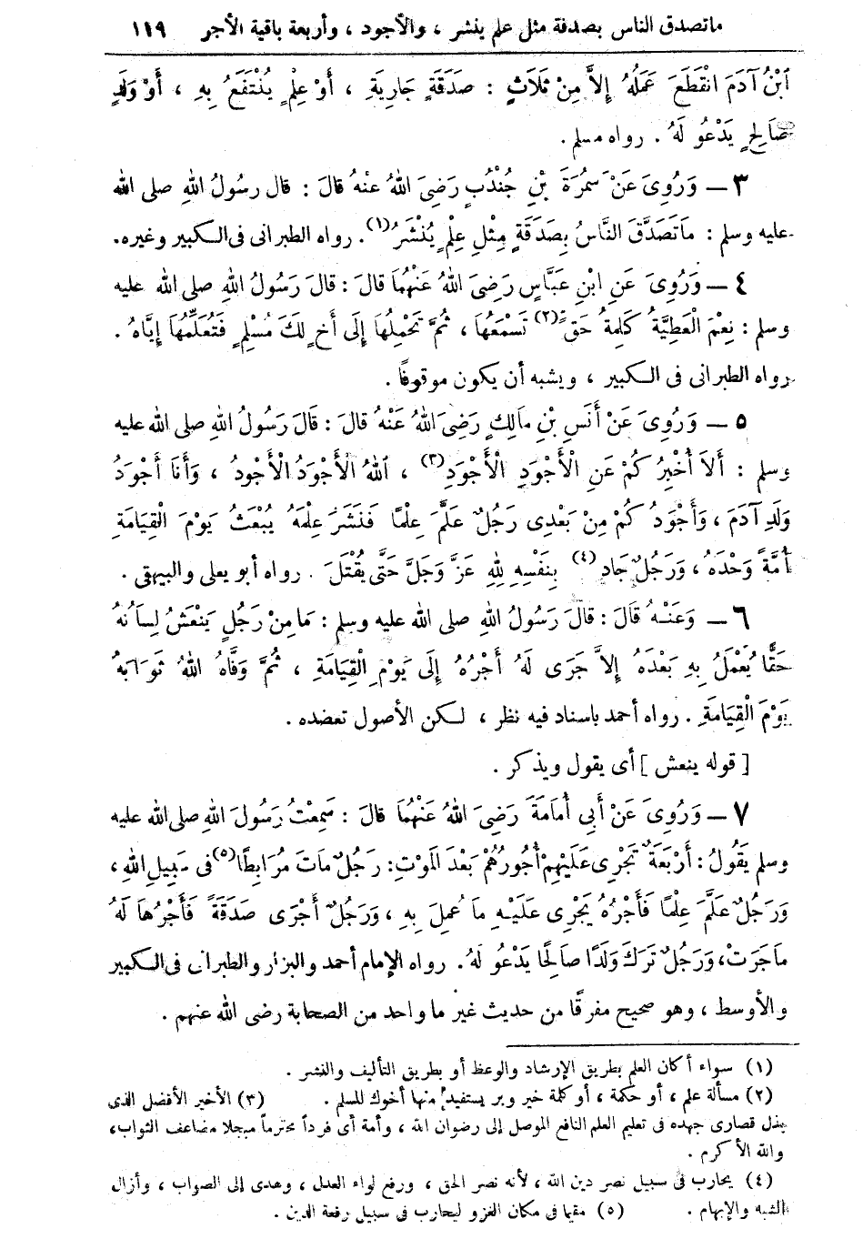 3 - وروى عن سمرة بن جندب رضي الله عنه قال: قال رسول الله صلى الله عليه وسلم: ما تصدَّق الناس بصدقة مثل علم ينشر (¬1). رواه الطبراني في الكبير وغيره.