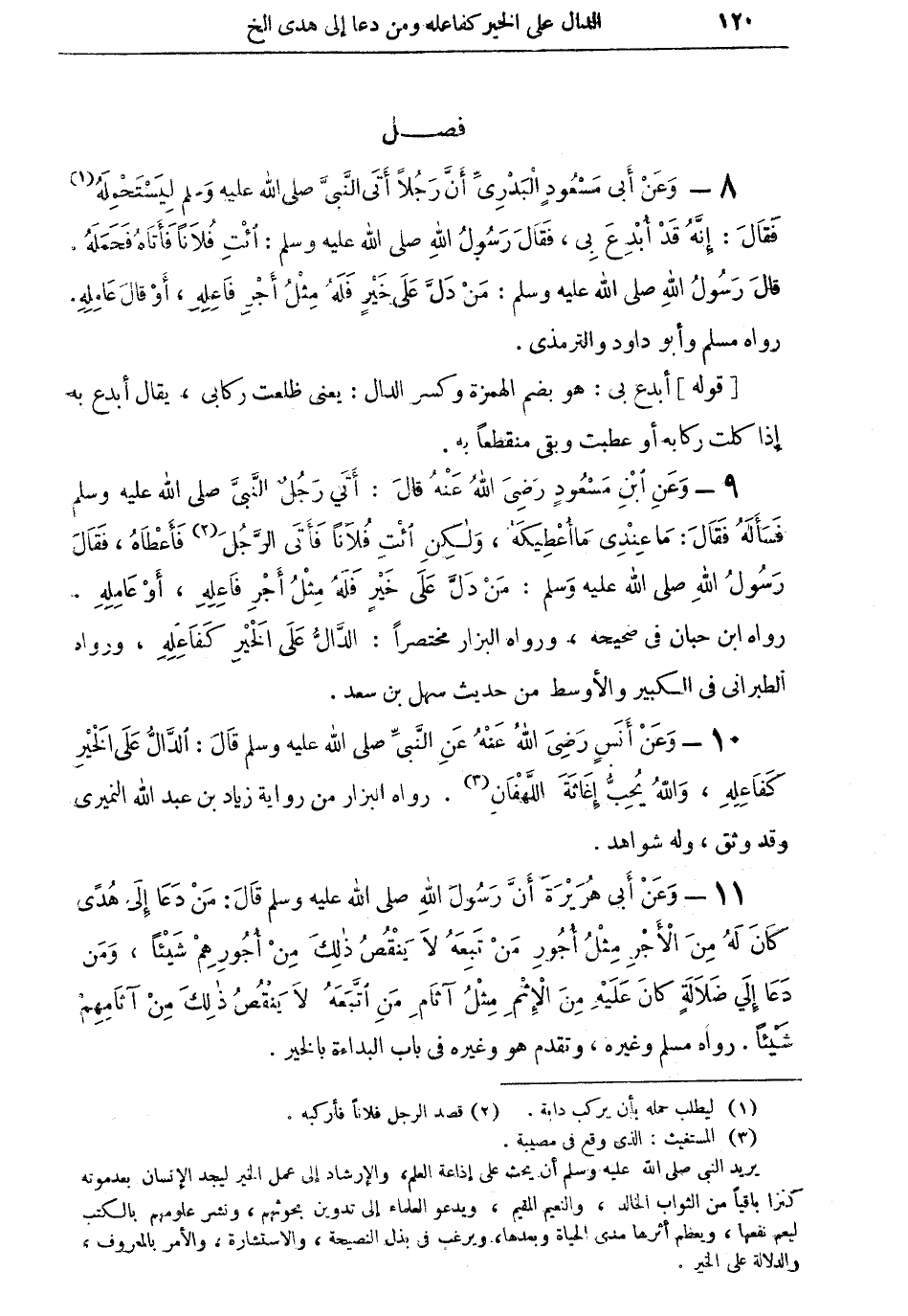 8 - وعن أبي مسعود البدرى أن رجلا أتى النبى صلى الله عليه وسلم ليستحمله (¬1) فقال: إنه قد أُبدع بى، فقال رسول الله صلى الله عليه وسلم: ائت فُلاناً فأتاهُ فحمله. قال رسول الله صلى الله عليه وسلم: من دلَّ على خير فله مثل أجرِ فاعله، أو قال: عامله. رواه مسلم وأبو داود والترمذي.