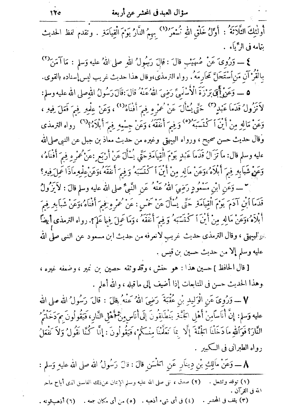 6 - وعن ابن مسعود رضى الله عنه عن النبى صلى الله عليه وسلم قال: لا يزولُ قدما ابن آدم يوم القيامة حتى يُسأل عن خمس: عن عُمره فيم أفناهُ، وعن شبابه فيم أبلاهُ، وعن ماله من أين اكتسبه وفيم أنفقه، وما عمل فيما علم؟. رواه الترمذي أيضاً والبيهقي، وقال الترمذي حديث غريب لا نعرفه من حديث ابن مسعود عن النبى صلى الله عليه وسلم إلا من حديث حسين بن قيس.