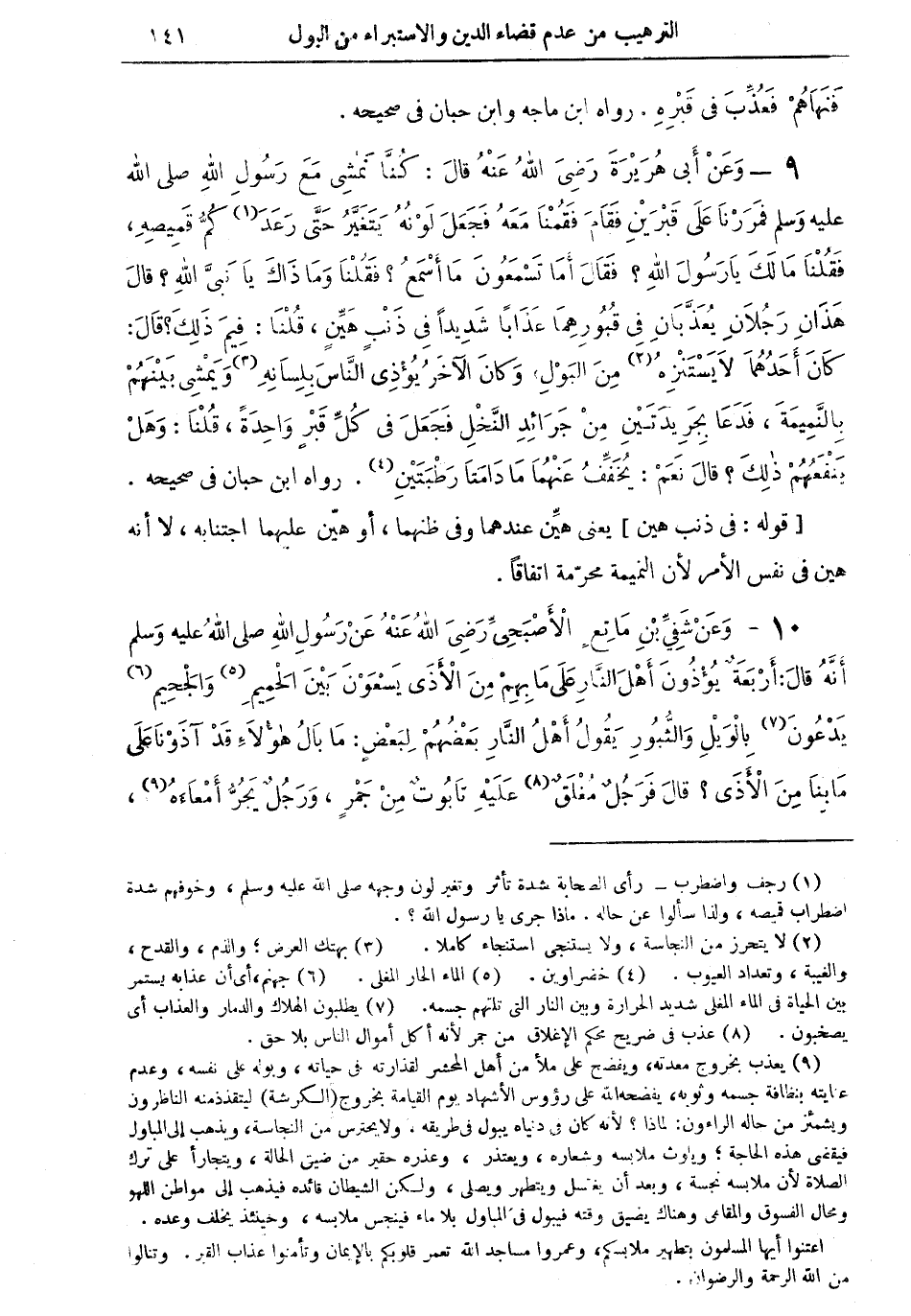 9 - وعن أبي هريرة رضي الله عنه قال: كنا نمشى مع رسول الله صلى الله عليه وسلم فمررنا على قبرين فقام فقمنا معه فجعل لونه يتغير حتى رعد (¬1) كُمُّ قميصه، فقلنا مالك يا رسول الله؟ فقال أما تسمعون ما أسمعُ؟ فقلنا وما ذاك يا نبى الله؟ قال هذان رجلان يعذبان في قبورهما عذابا شديدا في ذنب هين، قلنا فيم ذلك؟ قال كان أحدهما لا يستنزه (¬2) من البول، وكان الآخر يؤذي الناس بلسانه (¬3) ويمشى بينهم بالنميمة، فدعا بجريدتين من جرائد النخل فجعل في كل قبرٍ واحدةً، قلنا: وهل ينفعهم ذلك؟ قال نعم: يخفف عنهما ما دامتا رطبتين (¬4).رواه ابن حبان في صحيحه.