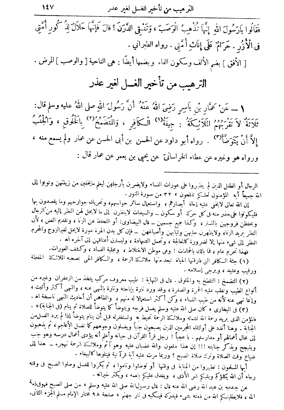 (¬3) في البخاري (كان صلى الله عليه وسلم يغسل فرجه ويتوضأ كما يتوضأ للصلاة ثم ينام (في الجنابة). فالمؤمن الذي يريد رحمة الله تشمله وملائكة الرحمة تحيط به وتستغفر له قبل أن ينام يتوضأ إذا لم يرد الغسل من الجنابة. وهنا أندد على أولئك المجرمين الذي يصبحون جنباً ويغسلون وجوههم كما تغسل الأعاجم، ثم يذهبون إلى محال أعمالهم أو مدارسهم. يا عجباً! رجل قرأ القرآن في حياته وأعلم أنه يؤدى أعمال درسه وهوجنب ويتبجح ويذكر جنابته!!! إن هذا ملعون والله غضابن عليه وهو آثم وملائكة الرحمة تهجره - هذا إلى ضياع وقت الصلاة وترك صلاة الصبح؟ وربما مرت عليه آية قرآنية فيتلوها كالببغاء.