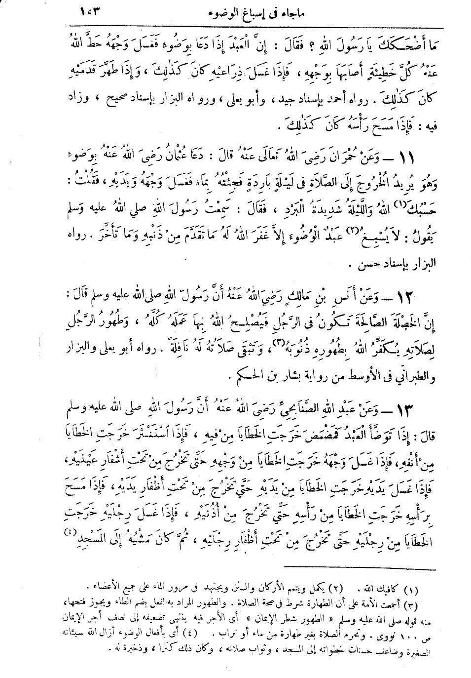 11 - وعن حُمران رضي الله تعالى عنه قال: دعا عثمان رضي الله عنه بوضوء وهو يريدُ الخروج إلى الصلاة في ليلة باردةٍ فجئته بماءٍ فغسل وجهه ويديه، فقلت: حسبك (¬1) الله والليلة شديدة البرد، فقال: سمعت رسول الله صلى الله عليه وسلم يقول: لا يُسبغُ (¬2) عبدٌ الوضوء إلا غفر الله له ما تقدم من ذنبه وما تأخر. رواه البزار بإسناد حسن.
