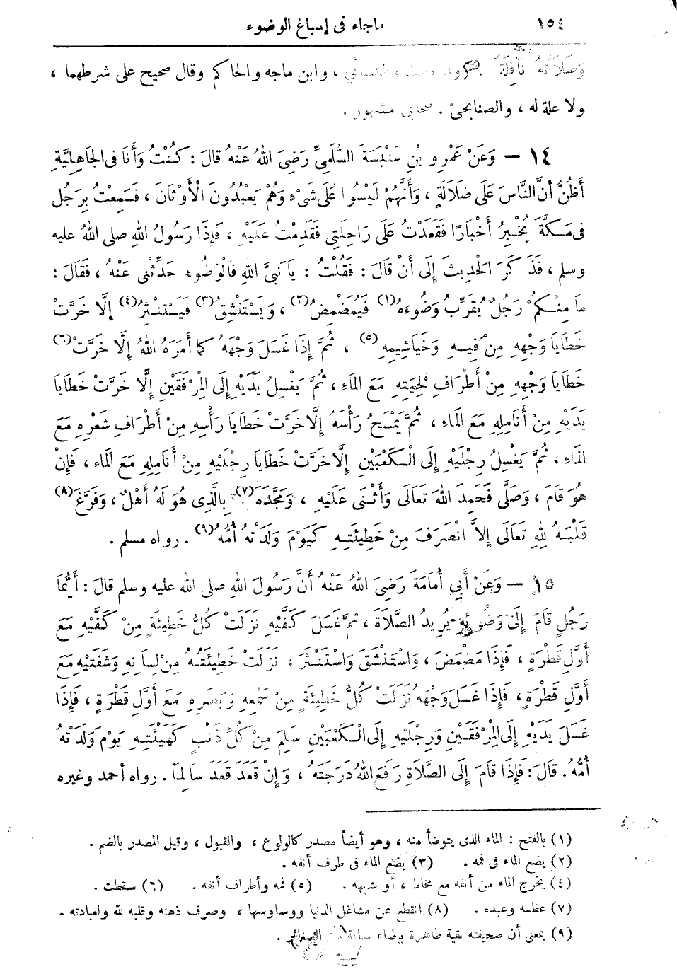 14 - وعن عمرو بن عنبسة السُّلَمِىَّ رضي الله عنه قال: كنت وأنا في الجاهلية أظن أن الناس على ضلالةٍ، وأنهم ليسوا على شيءٍ وهم يعبدون الأوثان، فسمعت برجل في مكة يُخبرُ أخباراً فقعدت على راحلتي فقدمت عليه، فإذا رسول الله صلى الله عليه وسلم، فذكر الحديث إلى أن قال: فقلت: يا نبىَّ الله فالوضوء حدثنى عنه، فقال: ما منكم رجلٌ يُقَرِّبُ وضوءَه (¬1) فيمضمض (¬2)، ويستنشق (¬3) فيستنثر (¬4) إلا خرجت خطايا وجهه من فيه وخياشيمه (¬5)، ثم إذا غسل وجهه كما أمر الله إلا خرت (¬6) خطايا وجهه من أطراف لحيته مع الماء، ثم يغسل يديه إلى المرفقين إلا خرَّت خطايا يديه من أنامله مع الماء، ثم يمسح رأسه إلا خرت خطايا رأسه من أطراف شعره مع الماء، ثم يغسل رجليه إلى الكعبين إلا خرت خطايا رجليه من أنامله مع الماء، فإن هو قام، وصلى فحمد الله تعالى وأثنى عليه، ومجده (¬7) بالذى هو له أهل، وفرَّغَ (¬8) قلبه لله تعالى إلا انصرف من خطيئته كيوم ولدته أمه (¬9). رواه مسلم.