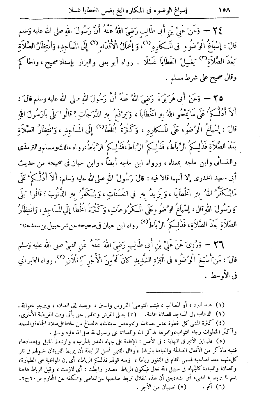 26 - وروى عن على بن أبى طالب رضي الله عنه عن النبى صلى الله عليه وسلم قال: من أسبغ (¬6) الوضوء في البرد الشديد كان له من الأجر كفلان (¬7). رواه الطبراني في الأوسط.