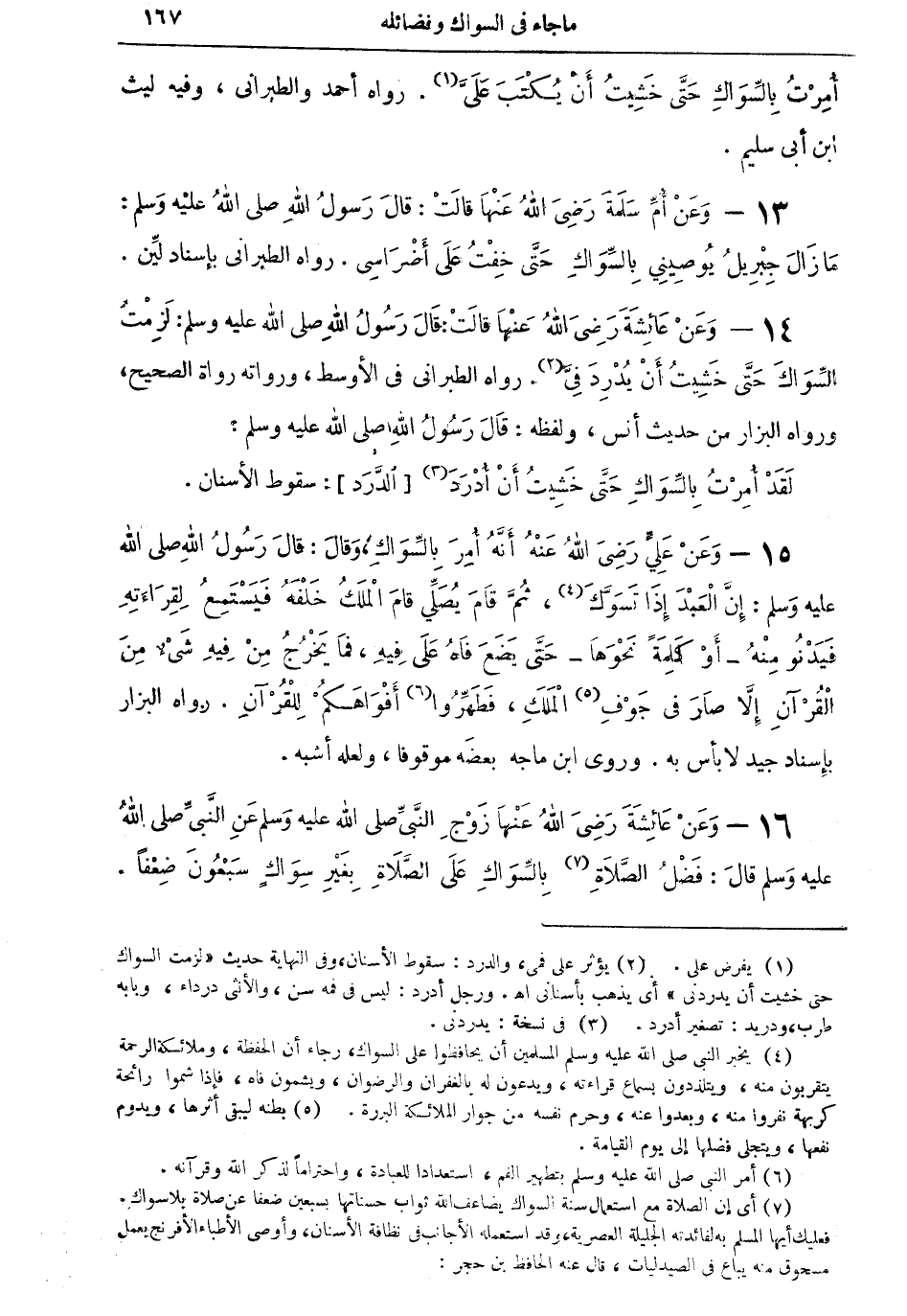 14 - وعن عائشة رضي الله عنها قالت: قال رسول الله صلى الله عليه وسلم: لزمت السواك حتى خشيتُ أن يدُردِ فيَّ (¬2). رواه الطبراني في الأوسط، ورواته رواة الصحيح، ورواه البزار من حديث أنس، ولفظه: قال رسول الله صلى الله عليه وسلم: