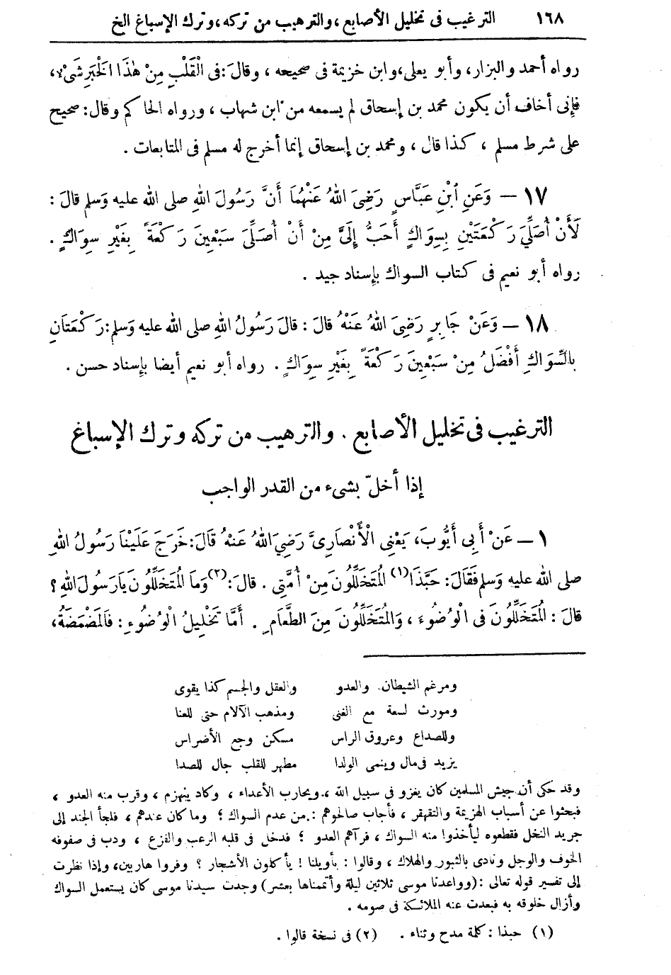 1 - عن أبي أيوب، يعنى الأنصارى رضي الله عنه قال: خرج علينا رسول الله صلى الله عليه وسلم فقال: حبذا (¬1) المُتخلِّلُون من أُمتى. قال: (¬2) وما المتخللون يا رسول الله؟ قال: المتخللون في الوضوء، والمتخللون من الطعام. أما تخليل الوضوء: فالمضمضة،