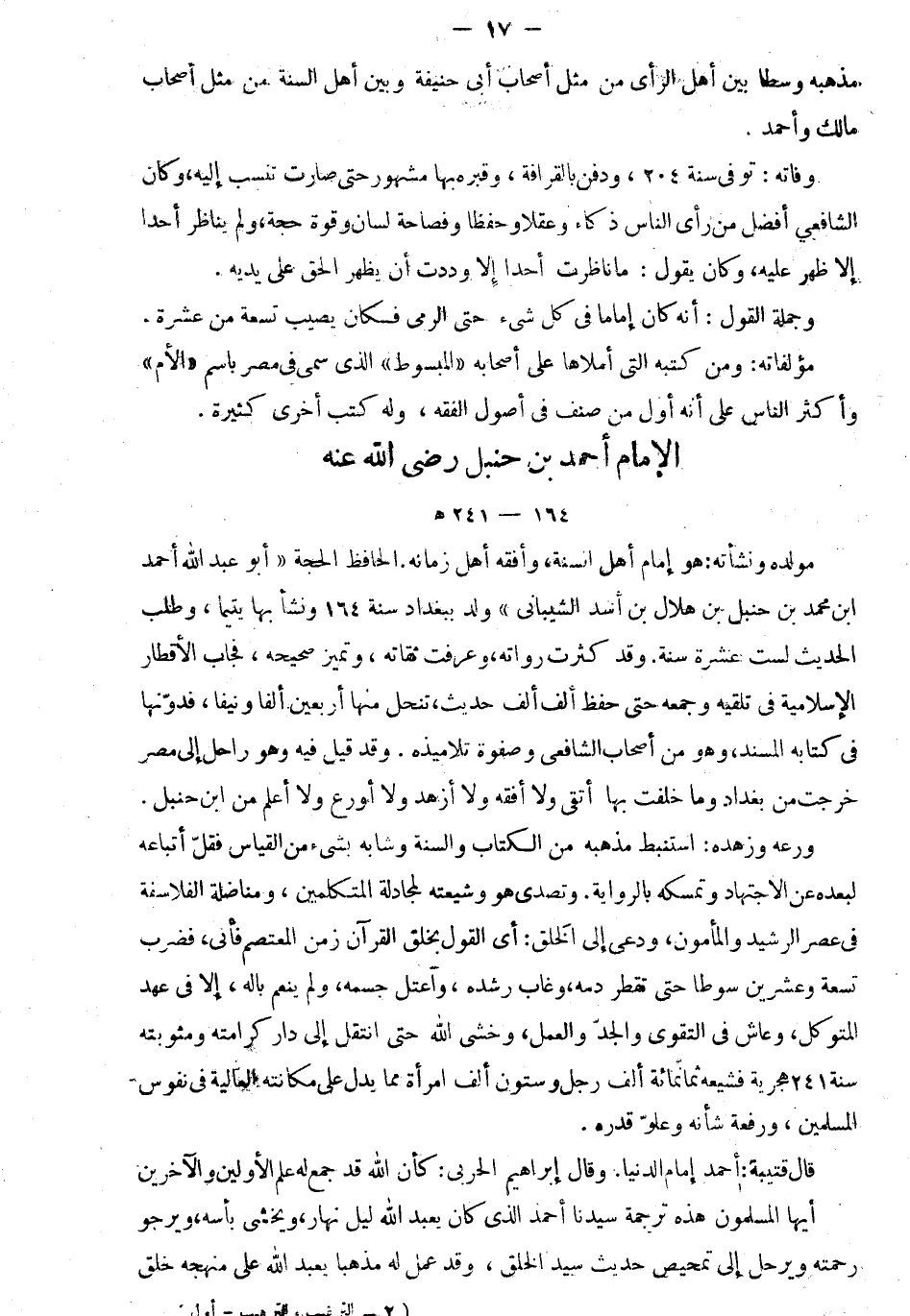 مولده ونشأته: هو إمام أهل السنة، وأفقه أهل زمانه. الحافظ الحجة (أبو عبد الله أحمد ابن محمد بن حنبل بن هلال بن أسد الشيبانى) ولد ببغداد سنة 164 ونشأ بها يتيما، وطلب الحديث لست عشرة سنة. وقد كثرت رواته، وعرفت ثقاته، وتميز صحيحه، فجاب الأقطار الإسلامية في تلقيه وجمعه حتى حفظ ألف ألف حديث، تنحل منها أربعين ألفا ونيفا، قدوّنها في كتابه المسند، وهو من أصحاب الشافعي وصفوة تلاميذه. وقد قيل فيه وهو راحل إلى مصر خرجت من بغداد وما خلفت بها أتقى ولا أفقه ولا أزهد ولا أروع ولا أعلم من ابن حنبل.