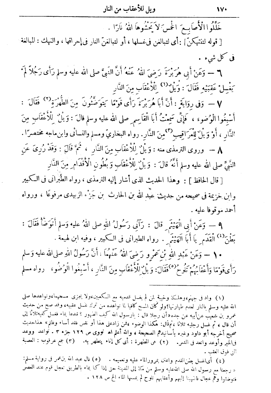 (¬5) قال عبد الله بن عمر في رواية مسلم: (رجعنا مع رسول الله صلى الله عليه وسلم من مكة إلى المدينة حتى كنا بماء بالطريق تعجل قوم عند العصر فتوضئوا وهم عجال فانتهينا إليهم وأعقابهم تلوح لم يسمها الماء الخ ص 128.