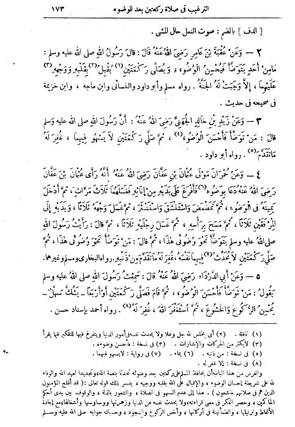 4 - وعن حُمران مولى عثمان بن عفان رضى الله عنه أنه رأى عثمان بن عفان رضى الله عنه دَعَا بوضوءٍ (¬6) فأفرغ على يديه من إنائه فغسلهما ثلاث مراتٍ، ثم أدخل يمينه في الوضوء، ثم تمضمض واستنشق واستنثر، ثم غسل وجهه ثلاثاً، ويديه إلى المرفقين ثلاثاً، ثم مسح برأسه، ثم غسل رجليه ثلاثاً، ثم قال: رأيت رسول الله صلى الله عليه وسلم يتوضأُ نحو وُضُوئى هذا، ثم قال: من توضأ نحو وُضُوئي هذا، ثمَّ صلى ركعتين لا يُحدث (¬7) فيهما نفسه، غفر له ما تقدم من ذنبه. رواه البخاري ومسلم وغيرهما.