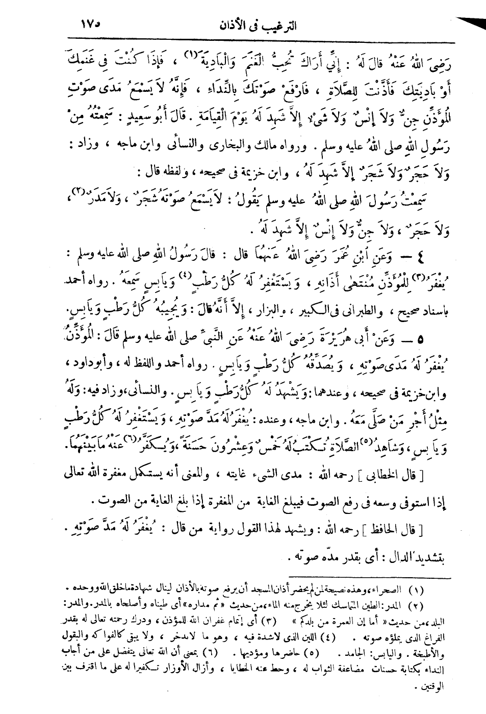 4 - وعن ابن عمر رضي الله عنهما قال: قال رسول الله صلى الله عليه وسلم: يُغفرُ (¬3) للمؤذن مُنتهى أذانهِ، ويستغفر له كل رطبٍ (¬4) ويابس سمعه. رواه أحمد باسناد صحيح، والطبراني في الكبير، والبزار، إلا أنه قال: ويُجيبهُ كلُّ رطبٍ ويابسٍ.