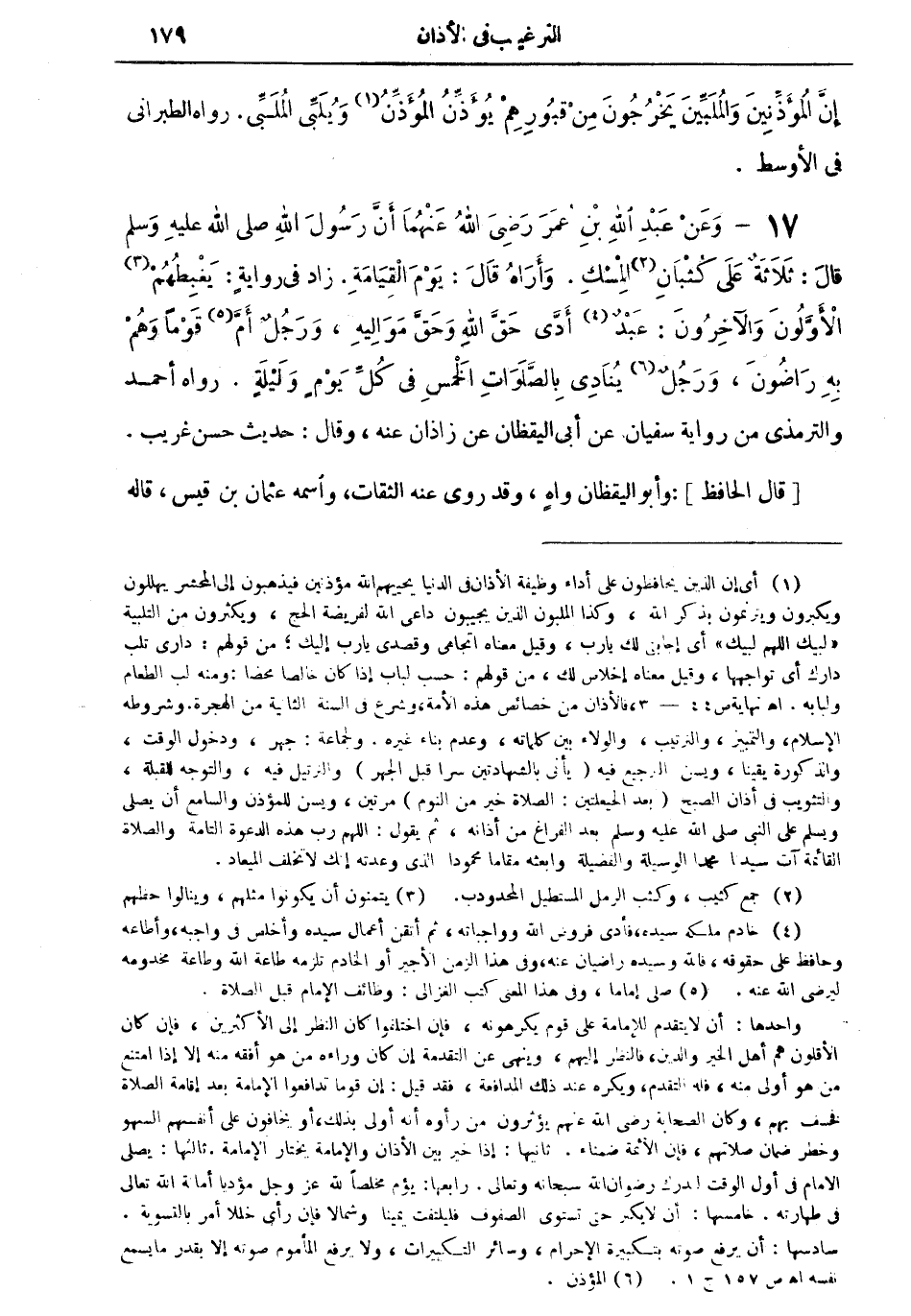 17 - وعن عبد الله بن عمر رضي الله عنهما أن رسول الله صلى الله عليه وسلم قال: ثلاثة على كثبان (¬2) المسك. وأراه قال: يوم القيامة. زاد في روايةٍ: يغبطُهُمْ (¬3) الأوَّلُونَ والآخرون: عبدٌ (¬4) أدَّى حق الله وحقَّ مواليه، ورجل أمَّ (¬5) قوماً وهم به راضون، ورجلٌ (¬6) ينادى بالصلوات الخمس في كل يومٍ وليلةٍ. رواه أحمد والترمذي من رواية سفيان عن أبي اليقظان عن زاذان عنه، وقال: حديث حسن غريب.
