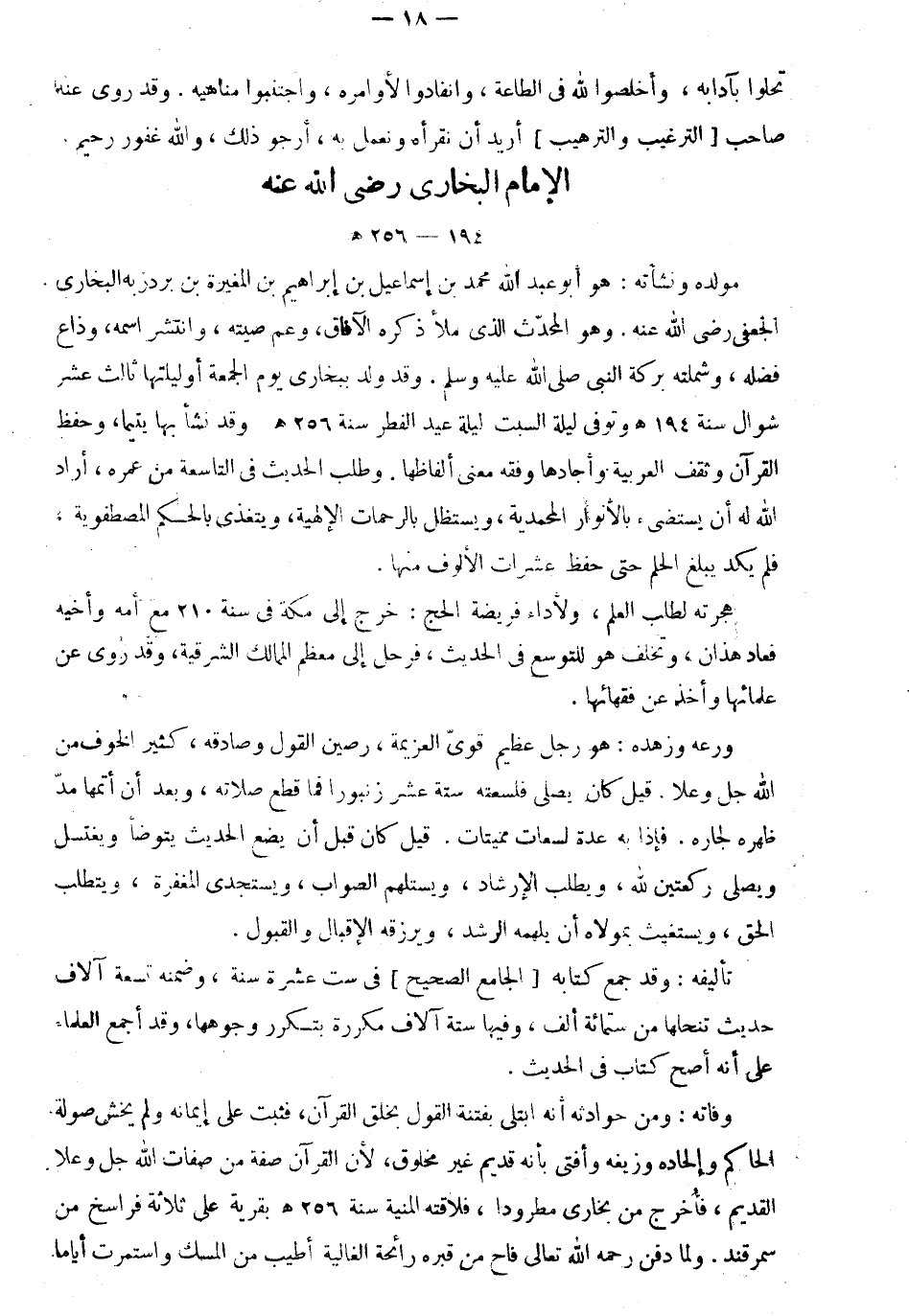 مولده ونشأته: هو أبو عبد الله محمد بن إسماعيل بن إبراهيم بن المغيرة بن بردزبه البخاري الجعفى رضي الله عنه. وهو المحدّث الذى ملأ ذكره الآفاق، وعم صيته، وانتشر اسمه، وذاع فضله، وشملته بركة النبى صلى الله عليه وسلم. وقد ولد ببخارى يوم الجمعة أو ليلتها ثالث عشر شوال سنة 194 هـ وتوفى ليلة السبت ليلة عيد الفطر سنة 256 هـ. وقد نشأ بها يتيما، وحفظ القرآن وثقف العربية وأجادها وفقه معنى ألفاظها، وطلب الحديث في التاسعة من عمره، أراد الله له أن يستضئ بالأنوار المحمدية، ويستظل بالرحمات الإِلهية، ويتغذى بالحكم المصطفوية، فلم يكد يبلغ الحلم حتى حفظ عشرات الألوف منها.