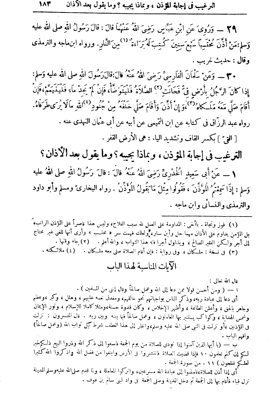 29 - وروى عن ابن عباسٍ رضي الله عنهما قال: قال رسول الله صلى الله عليه وسلم: من أذن محتسباً سبع سنين كُتِبَ له براءة (¬1) من النار. ورواه ابن ماجه والترمذي وقال: حديث غريب.