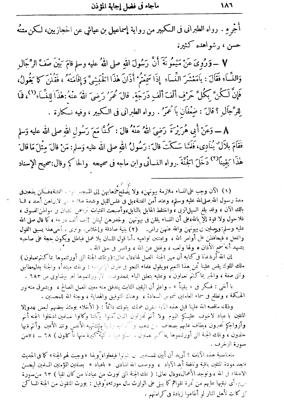7 - وروى عن ميمونة أن رسول الله صلى الله عليه وسلم قام بين صف الرجال والنساء فقال: يا معشر النساء إذا سمعتم أذان هذا الحبشي وإقامته، فقلن كما يقول، فإن لَكُنَّ بكل حرفٍ ألف ألف درجةٍ. قال عمر رضي الله عنه: هذا للنساء (¬1)، فما للرجال؟ قال: ضعفان يا عمر. رواه الطبراني في الكبير، وفيه نكارة.