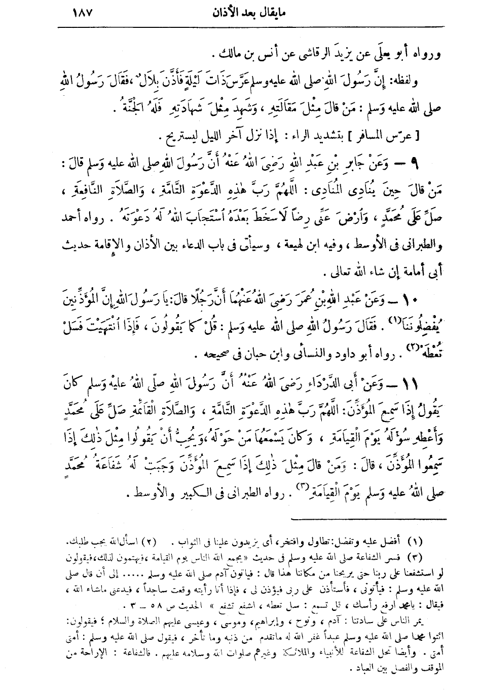 11 - وعن أبي الدرداء رضي الله عنه أن رسول الله صلى الله عليه وسلم كان يقول إذا سمع المؤذن: اللهم رب هذه الدعوة التامة، والصلاة القائمة صل على محمدٍ وأعطهِ سُؤلَهُ يوم القيامة، وكان يسمعها من حوله، ويجب أن يقولوا مثل ذلك إذا سَمِعُوا المُؤَذِّنَ، قال: ومن قال مثل ذلك إذا سمع المؤذن وجبت له شفاعة محمدٍ صلى الله عليه وسلم يوم القيامة (¬3).