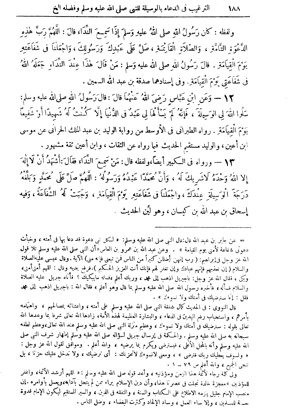 12 - وعن ابن عباس رضي الله عنهما قال: قال رسول الله صلى الله عليه وسلم: سلوا الله لى الوسيلة، فإنه لم يسألها لى عبد في الدنيا إلا كُنتُ له شهيداً أو شفيعاً يوم القيامة. رواه الطبراني في الأوسط من رواية الوليد بن عبد الملك الحرانى عن موسى بن أعين، والوليد مستقيم الحديث فيما رواه عن الثقات، وابن أعين ثقة مشهور.