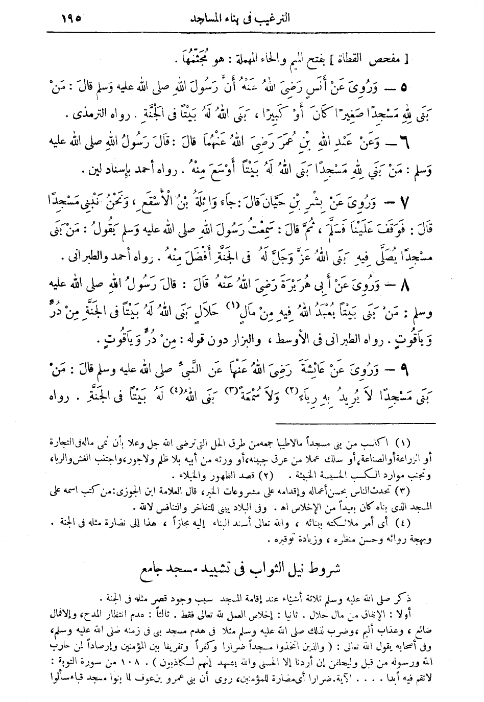 (¬1) اكتسب من بنى مسجداً مالا طيبا جمعه من طرق الحل التى ترضى الله جل وعلا بأن نمى ماله في التجارة أو الزراعة أو الصناعة، أو سلك عملا من عرق جبينه، أو ورثه من أبيه بلا ظلم ولا جور، واجتنب الغش والربا، وتجنب موارد الكسب الخسيسة الخبيثة.