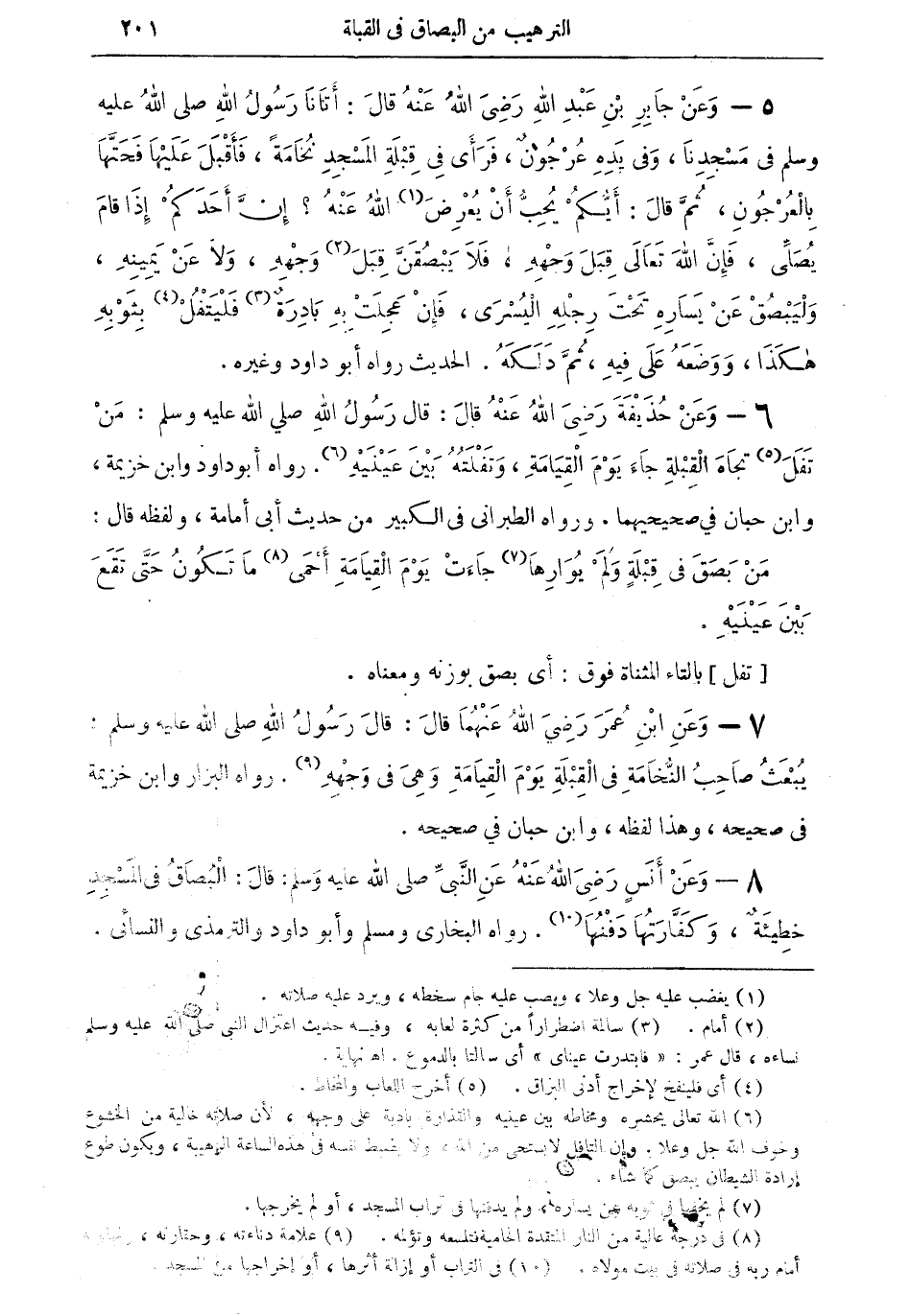 6 - وعن حذيفة رضي الله عنه قال: قال رسول الله صلى الله عليه وسلم: من تفل (¬5) تجاه القبلة جاء يوم القيامة، وتفلته بين عينيه (¬6). رواه أبو داود وابن خزيمة، وابن حبان في صحيحيهما، ورواه الطبراني في الكبير من حديث أبى أمامة، ولفظه قال: من بصق في قبلةٍ ولم يُوارِها (¬7) جاءت يوم القيامة أحمى (¬8) ما تكون حتى تقع بين عينيه.