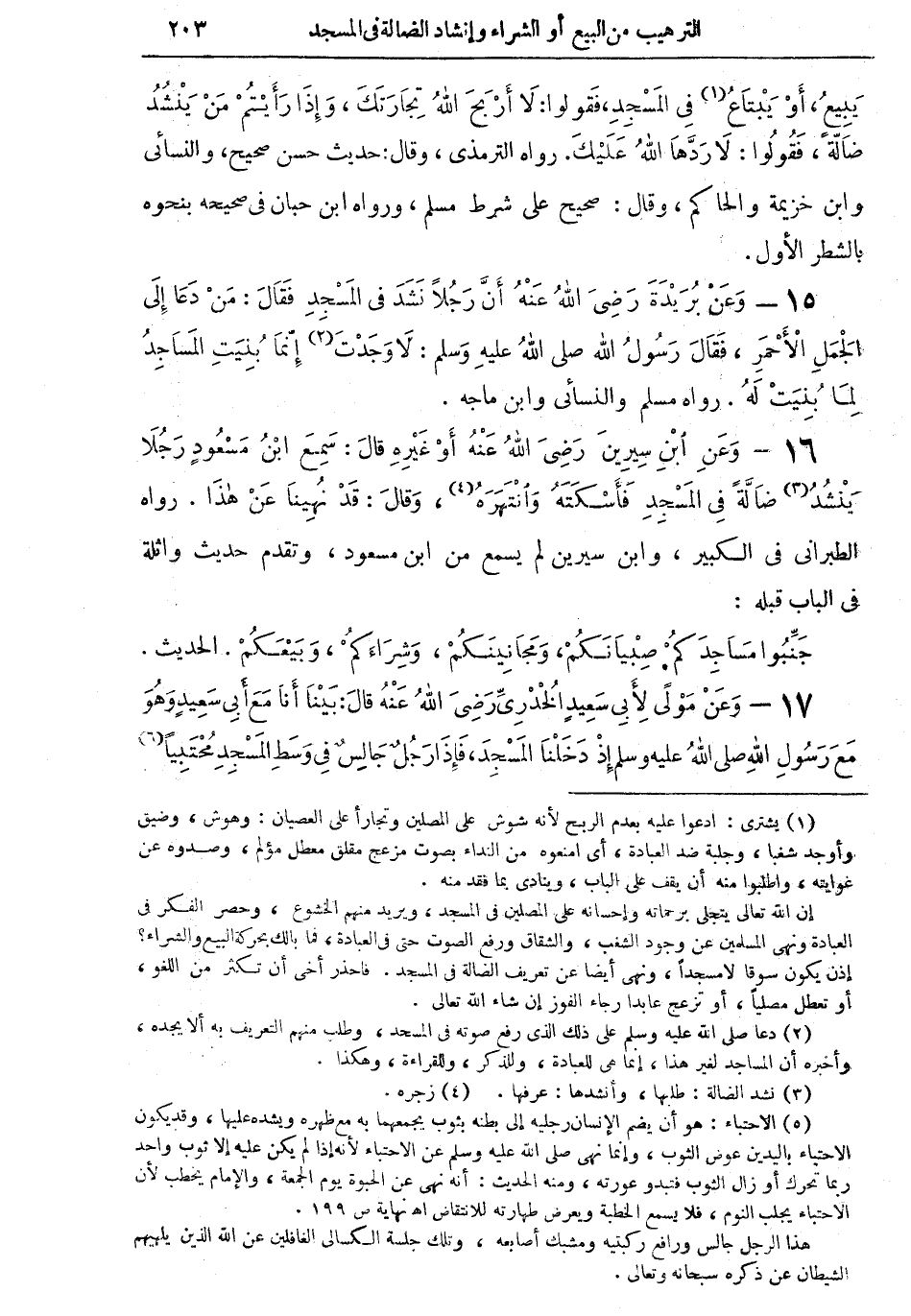 في المسجد، فقولوا: لا أربح الله تجارتك، وإذا رأيتم من ينشد ضالة، فقولوا: لا ردها الله عليك. رواه الترمذي، وقال: حديث حسن صحيح، والنسائي وابن خزيمة والحاكم، وقال: صحيح على شرط مسلم، ورواه ابن حبان في صحيحه بنحوه بالشطر الأول.