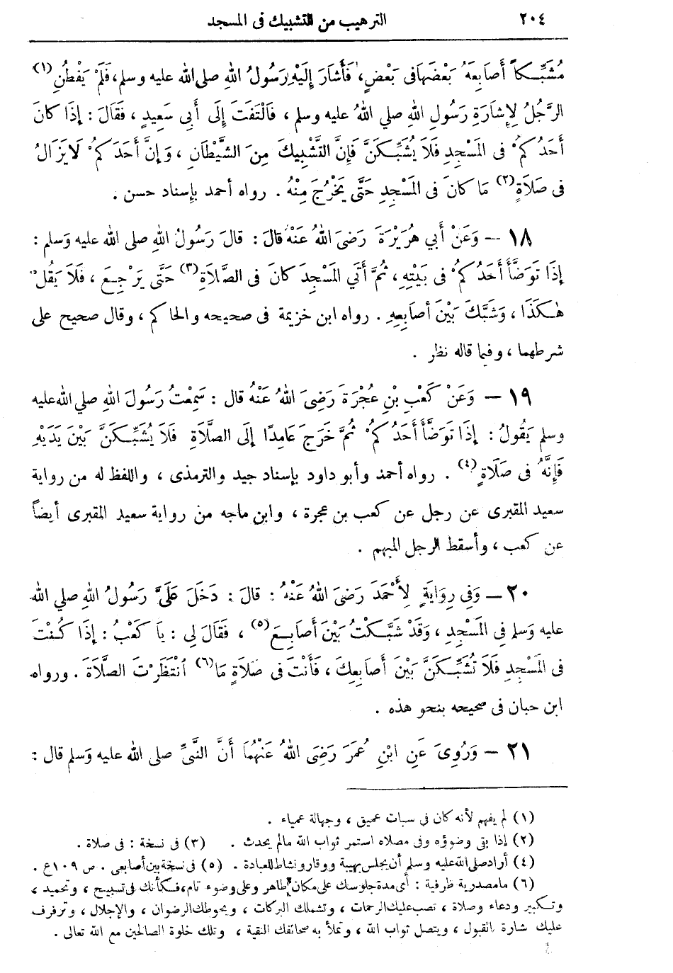 19 - وعن كعب بن عجرة رضي الله عنه قال: سمعت رسول الله صلى الله عليه وسلم يقول: إذا توضأ أحدكم ثم خرج عامداً إلى الصلاة فلا يُشبكن بين يديه فإنه في صلاةٍ (¬4). رواه أحمد وأبو داود بإسناد جيد والترمذي، واللفظ له من رواية سعيد المقبرى عن رجل عن كعب بن عجرة، وابن ماجه من رواية سعيد المقبرى أيضاً عن كعب، وأسقط الرجل المبهم.