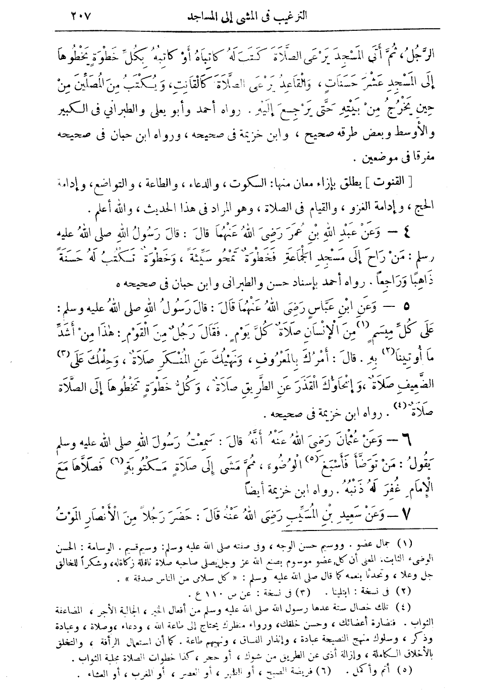 4 - وعن عبد الله بن عمر رضي الله عنهما قال: قال رسول الله صلى الله عليه وسلم: من راح إلى مسجد الجماعة فخطوةٌ تمحو سيئة، وخطوة تكتب له حسنةً ذاهباً وراجعاً. رواه أحمد بإسناد حسن والطبراني وابن حبان في صحيحه.