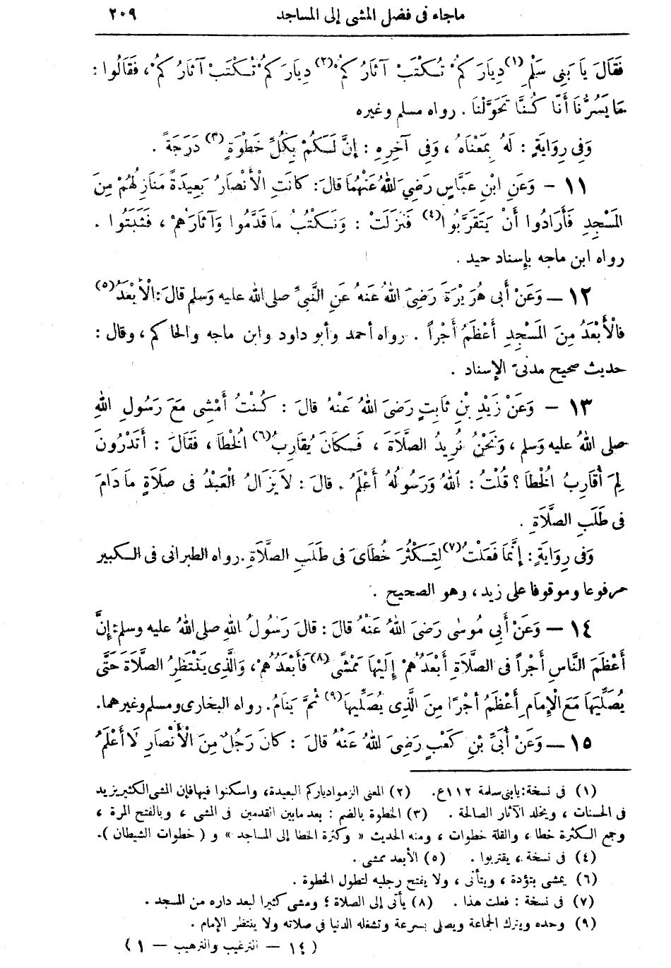 12 - وعن أبي هريرة رضي الله عنه عن النبى صلى الله عليه وسلم قال: الأبعد (¬5) فالأبعد من المسجد أعظم أجراً. رواه أحمد وأبو داود وابن ماجه والحاكم، وقال: حديث صحيح مدنىّ الإسناد.