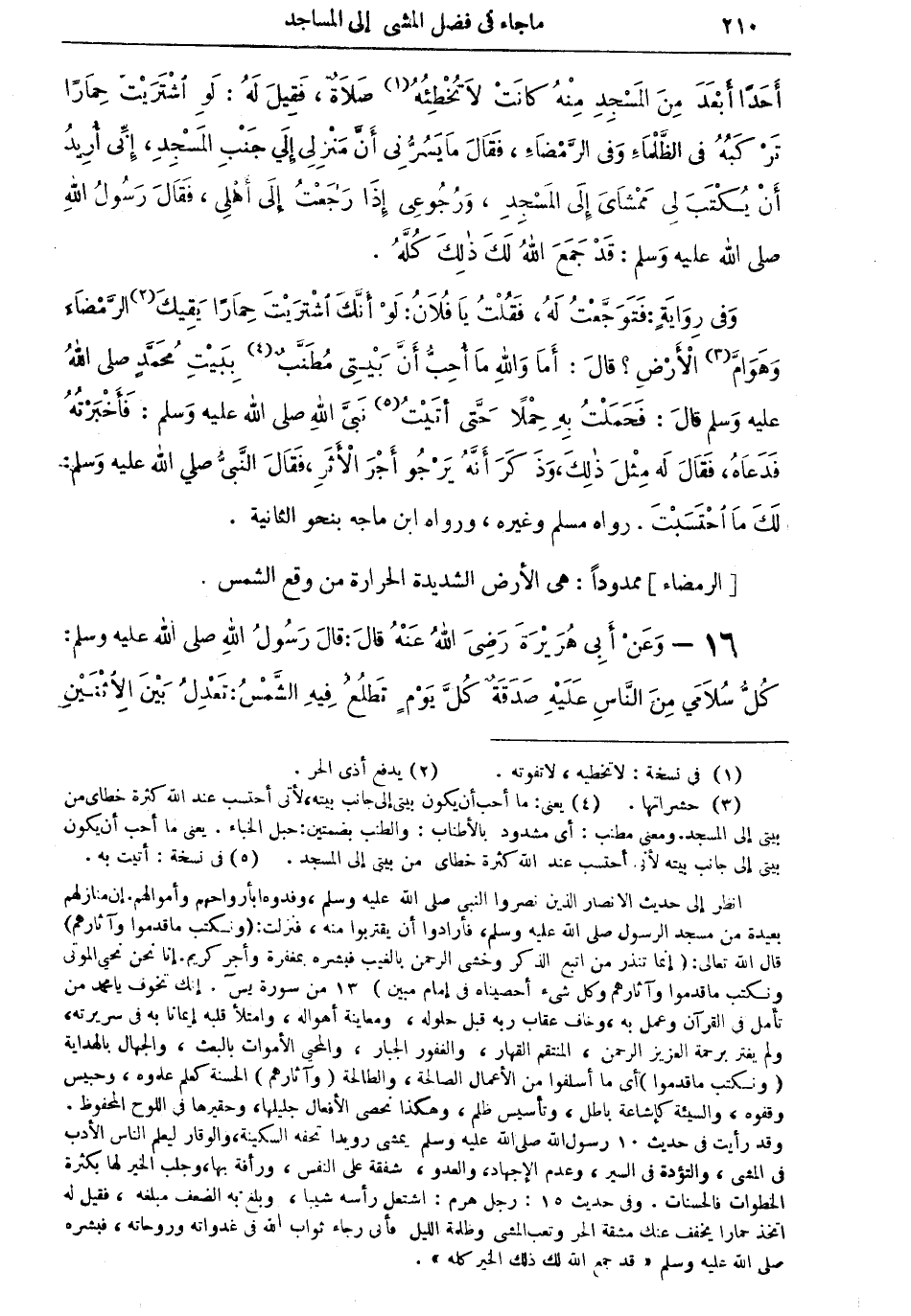 (¬4) يعنى: ما أحب أن يكون بينى إلى جانب بيته، لأنى احتسب عند الله كثرة خطاى من بيتى إلى المسجد. ومعنى مطنب: أي مشدود بالأطناب: والطنب بضمتين: حبل الخباء. يعنى ما أحب أن يكون بيتى إلى جانب بيته لأنى أحتسب عند الله كثرة خطاى من بيتى إلى المسجد.