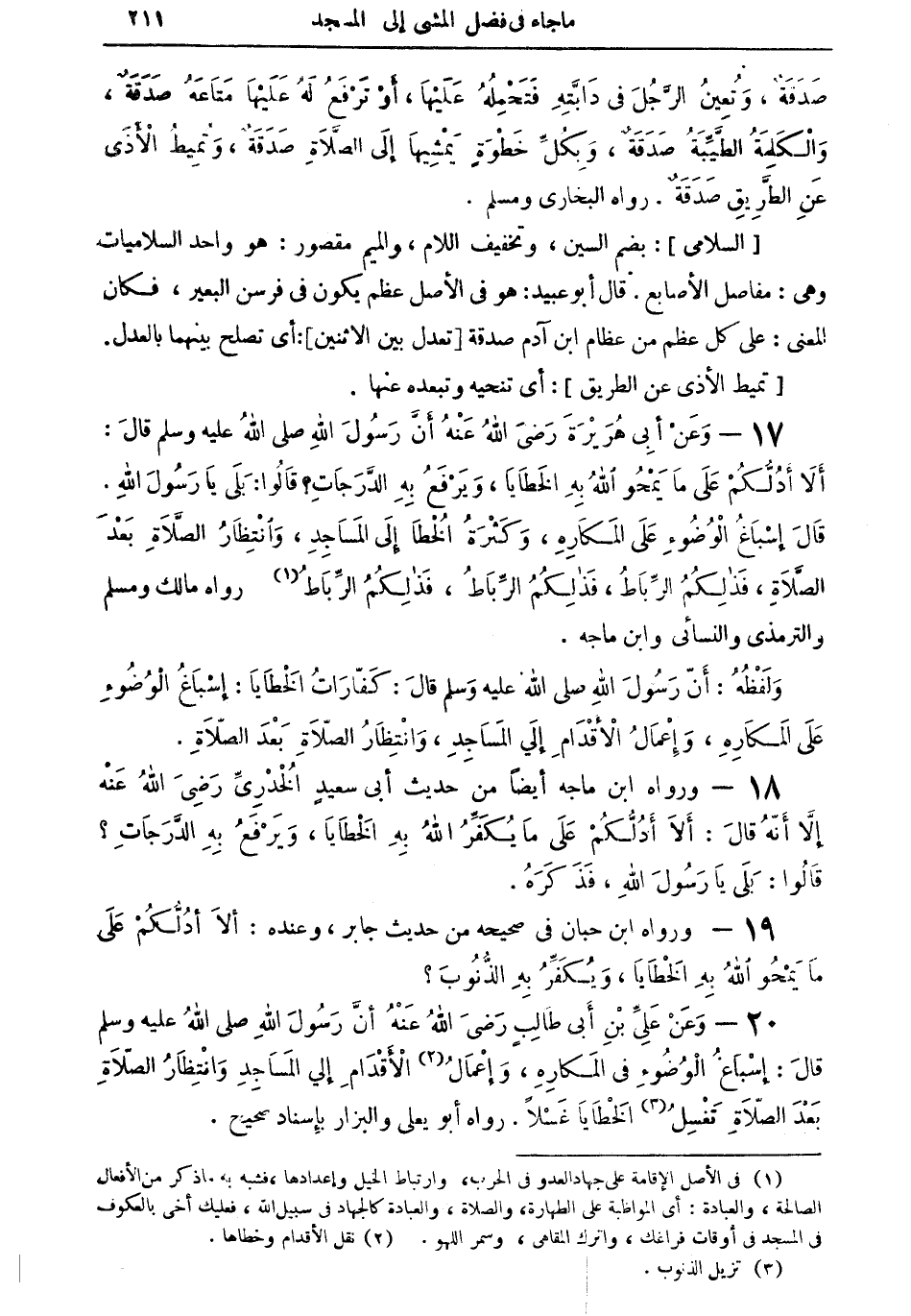 20 - وعن على بن أبى طالبٍ رضي الله عنه أن رسول الله صلى الله عليه وسلم قال: إسباغ الوضوء في المكاره، وإعمال (¬2) الأقدام إلى المساجد وانتظار الصلاة بعد الصلاة تغسل (¬3) الخطايا غسلاً. رواه أبى يعلى والبزار بإسناد صحيح.