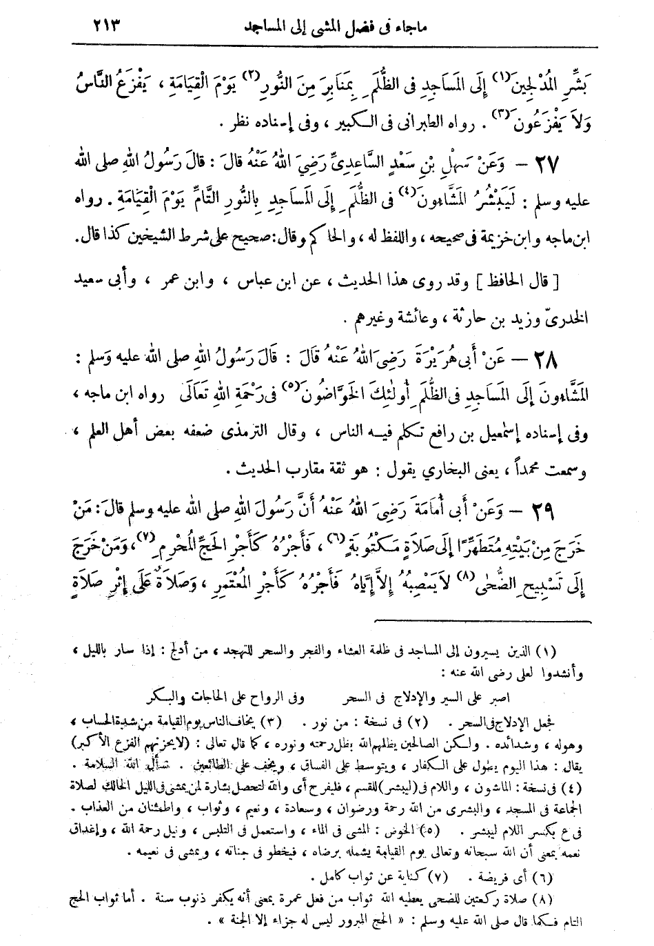 27 - وعن سهل بن سعدٍ الساعدى رضي الله عنه قال: قال رسول الله صلى الله عليه وسلم: ليبشر المشاءون (¬4) في الظُّلَمِ إلى المساجد بالنور التام يوم القيامة. رواه ابن ماجه وابن خزيمة في صحيحه، واللفظ له، والحاكم وقال: صحيح على شرط الشيخين كذا قال.
