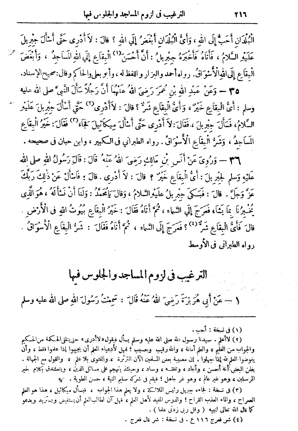 35 - وعن عبد الله بن عمر رضي الله عنهما أن رجلاً سأل النبى صلى الله عليه وسلم: أىُّ البقاع خيرٌ، وأىُّ البقاع شرٌّ؟ قال: لا أدرى (¬2) حتى أسأل جبريل عليه السلام، فسأل جبريل، فقال: لا أدرى حتى أسأل ميكائيل فجاء (¬3) فقال: خير البقاع المساجد، وشرُّ البقاع الأسواق. رواه الطبراني في الكبير، وابن حبان في صحيحه.