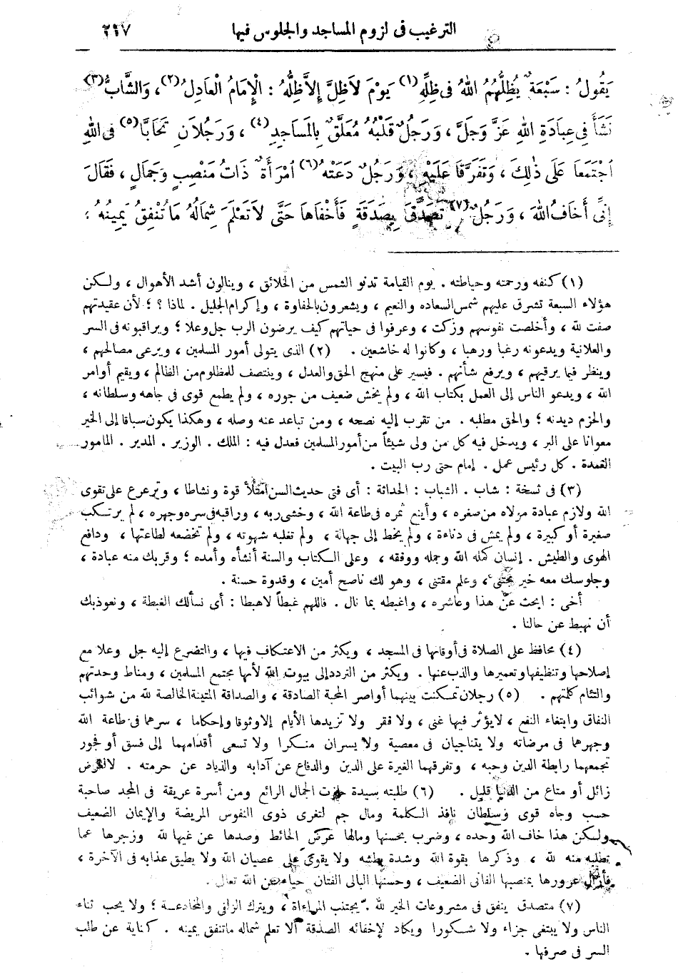 نشأ في عبادة الله عز وجل، ورجلٌ قلبه معلقٌ بالمساجد (¬4)، ورجلان تحابا (¬5) في الله اجتمعا على ذلك، وتفرقا عليه، ورجلٌ دعته (¬6) امرأة ذات منصب وجمال، فقال إنى أخاف الله، ورجلٌ (¬7)