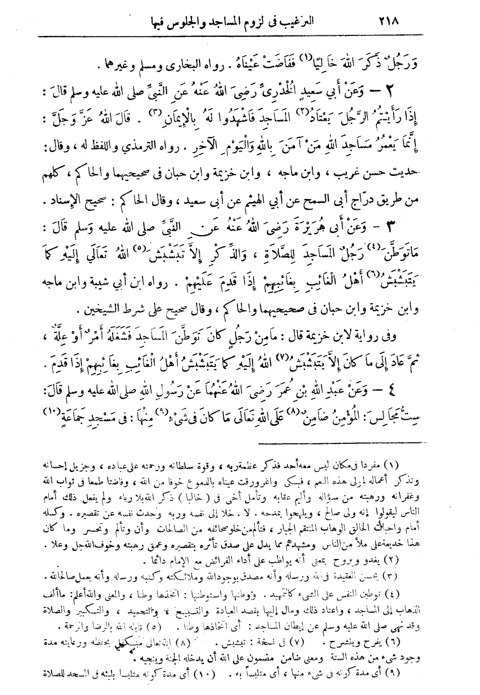 3 - وعن أبي هريرة رضي الله عنه عن النبى صلى الله عليه وسلم قال: ما توطَّن (¬4) رجل المساجد للصلاة، والذكر إلا تبشبش (¬5) الله تعالى إليه كما يتبشبش (¬6) أهل الغائب بغائبهم إذا قدم عليهم. رواه ابن أبى شيبة وابن ماجه وابن خزيمة وابن حبان في صحيحيهما والحاكم، وقال صحيح على شرط الشيخين.