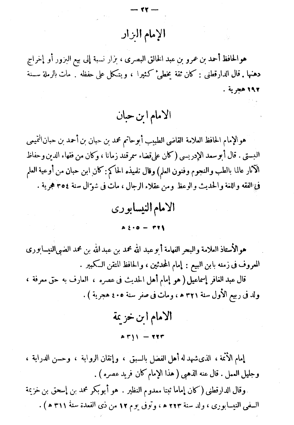 وقال الدراقطنى (كان إماما ثبتا معدوم النظير. هو أبو بكر محمد بن إسحق بن خزيمة السلمي النيسابوري، ولد سنة 223 هـ، وتوفي يوم 12 من ذي القعدة سنة 311 هـ).
